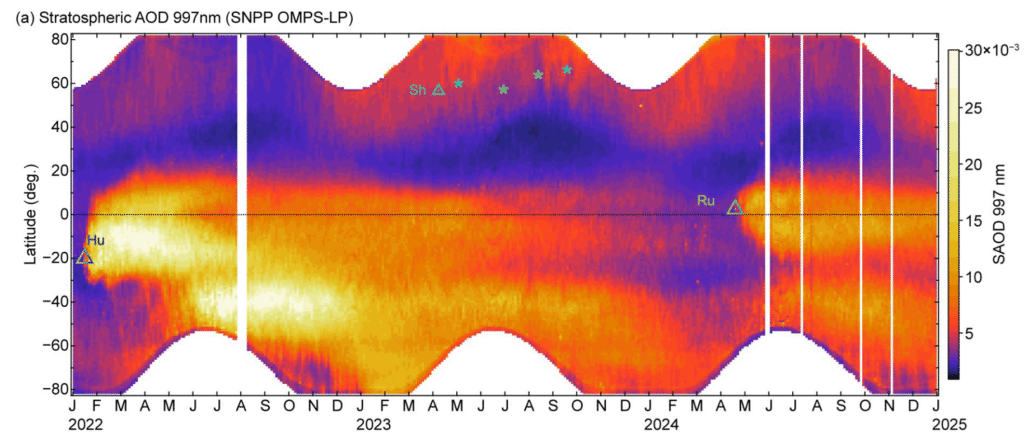 Oś pozioma: czas (lata i miesiące). Oś pionowa: szerokość geograficzna (stopnie). Kolory obrazują wartośći grubości optycznej na długości fali 997 nm, jaśniejsze kolory odpowiadają stratosferze mniej przezroczystej (bezwymiarowa). Trójkąty oznaczają czas i miejsce erupcji wuklanicznych: Hunga Tonga-Hunga Ha’apai w Polinezji (Hu), Szywiełucz na Kamczatce (Sh) i Ruang w Indonezji (Ru). Gwiazdki oznaczają pożary tajgi kandadyjskiej i syberyjskiej latem 2023 roku, z których sadza dostała się aż do stratosfery. Kolor biały oznacza brak pomiarów.