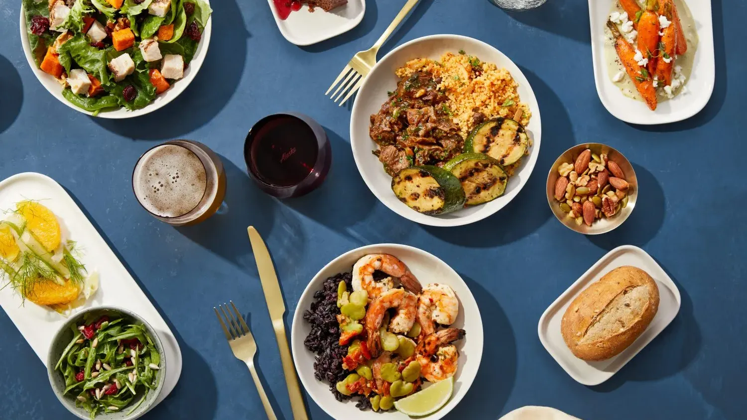 features a textured stoneware bowl, a custom flatware set featuring a brass-tone knife, fork, and spoon, a brass-accent bowl, and a sleek new tray. The airline also replaced separate soda and wine glasses with new all-purpose beverage glasses that feature a modern smoky finish.