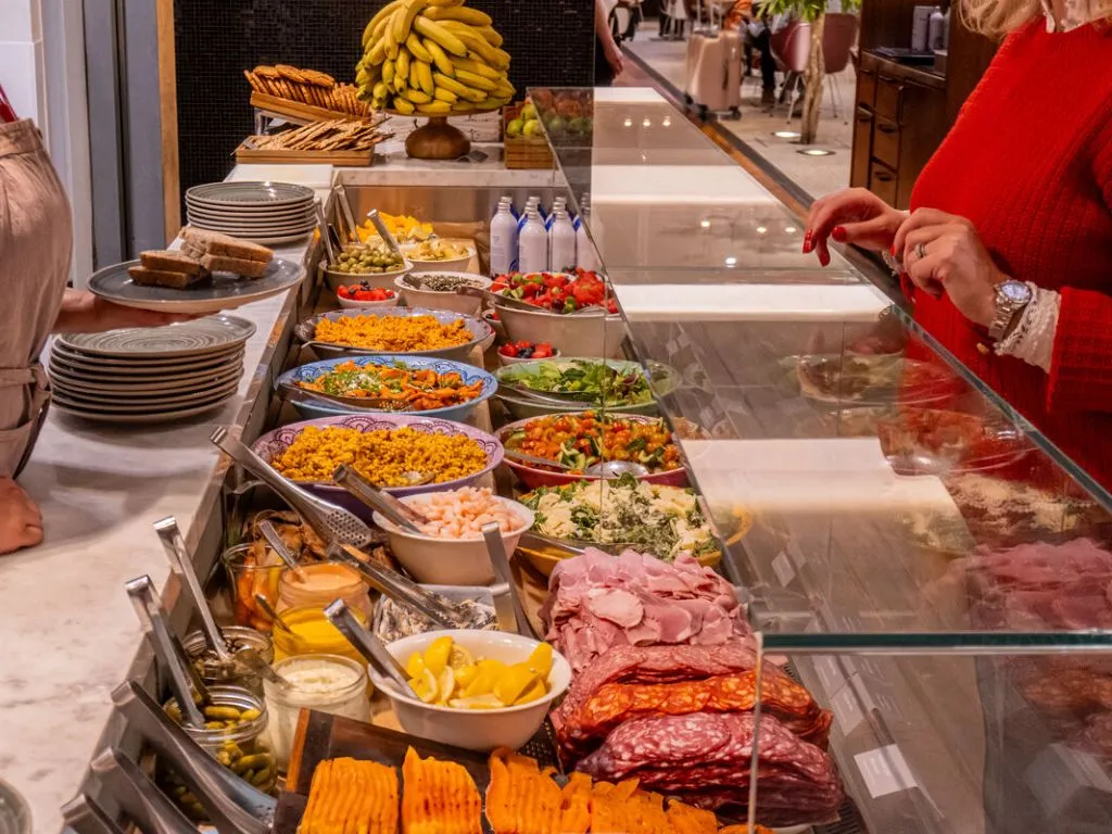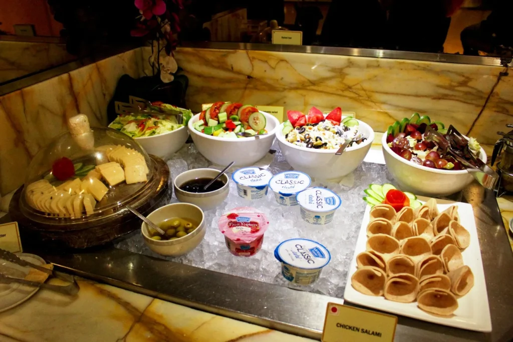 The buffet features a blend of Middle Eastern dishes such as lamb kofta, hummus, and freshly baked breads, alongside international staples like pastas and grilled meats. There’s also an à la carte dining area for those who prefer a more tailored meal before boarding.