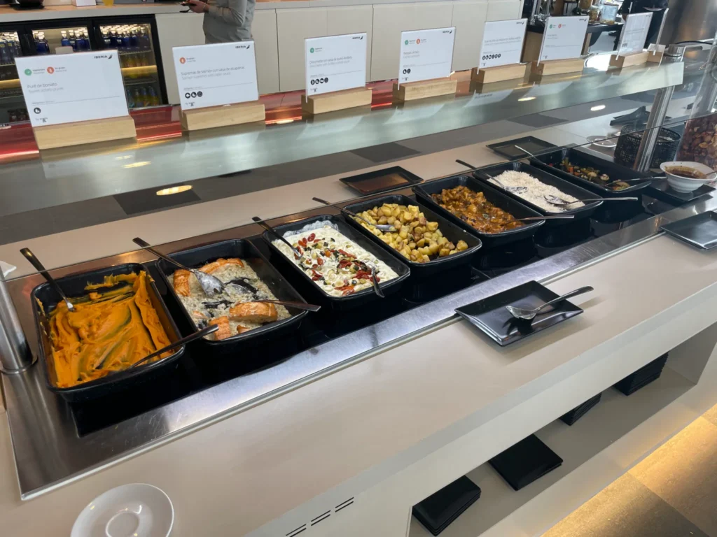 Iberia’s Velazquez Lounge at Madrid Barajas is a stylish space where food is taken seriously. Guests can enjoy a rotating buffet of Spanish dishes — think Iberian ham, tortilla, paella, and freshly baked bread — alongside international options for those seeking something lighter.