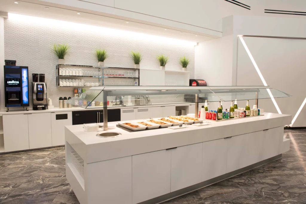 The dessert station is a true highlight — from delicate tarts to rich chocolate mousse, it feels like stepping into a Parisian patisserie. Guests can opt for a quick buffet meal or enjoy more leisurely dining in dedicated seating areas. The lounge itself is modern yet intimate, designed for comfort and style.
