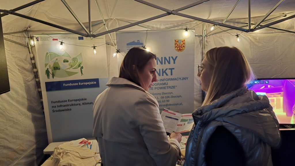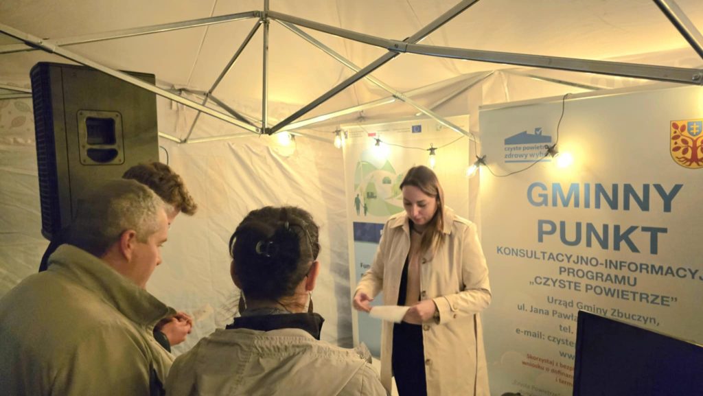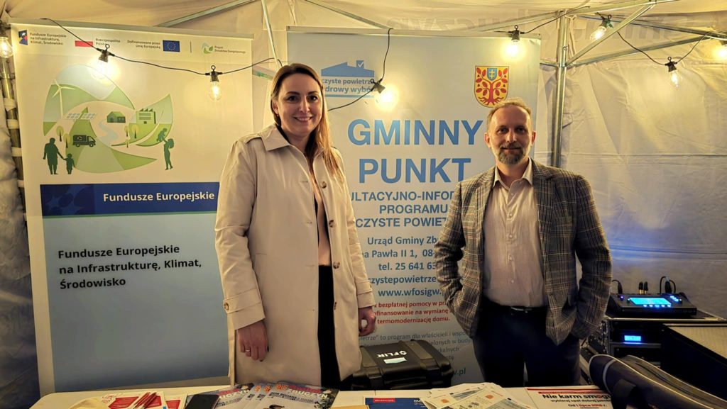 Nasze stoisko znajdowało się w namiocie Gminnego Punktu Konsultacyjno-Informacyjnego Programu „Czyste Powietrze”. Razem z Ekodoradcą Gminy Zbuczyn Jackiem Kędzierskim Emilia odpowiadała na pytania mieszkańców i tłumaczyła, jakie możliwości dają różne programy dofinansowań – od wymiany źródeł ciepła, przez poprawę efektywności energetycznej budynków, aż po inwestycje w odnawialne źródła energii.