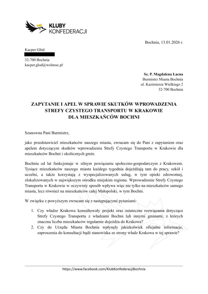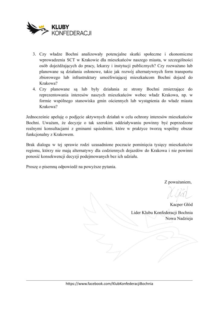 Tysiące mieszkańców Bochni każdego tygodnia dojeżdża do Krakowa do pracy, lekarzy i instytucji publicznych. Wprowadzenie SCT bez realnych alternatyw transportowych może oznaczać wykluczenie komunikacyjne wielu osób, które dziś nie mają możliwości zmiany środka transportu -podkreśla Kacper Głód.