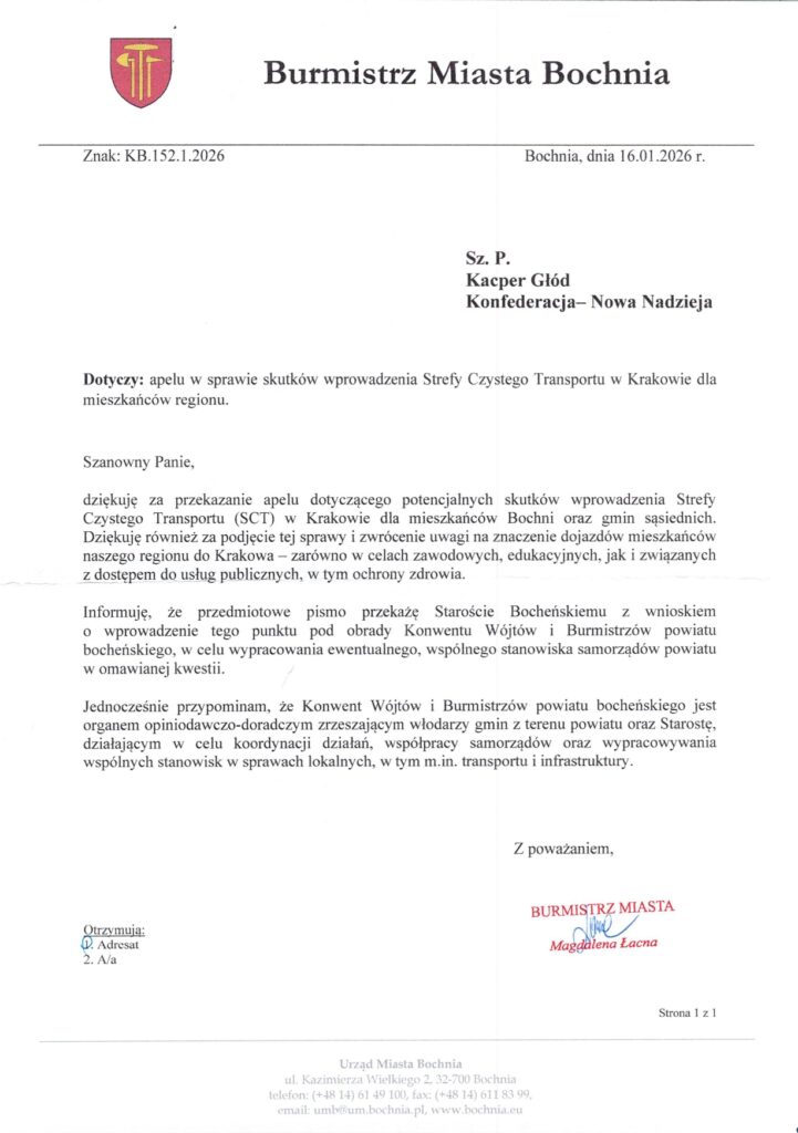 Tysiące mieszkańców Bochni każdego tygodnia dojeżdża do Krakowa do pracy, lekarzy i instytucji publicznych. Wprowadzenie SCT bez realnych alternatyw transportowych może oznaczać wykluczenie komunikacyjne wielu osób, które dziś nie mają możliwości zmiany środka transportu -podkreślał w piśmie do burmistrz Kacper Głód. ZOBACZ