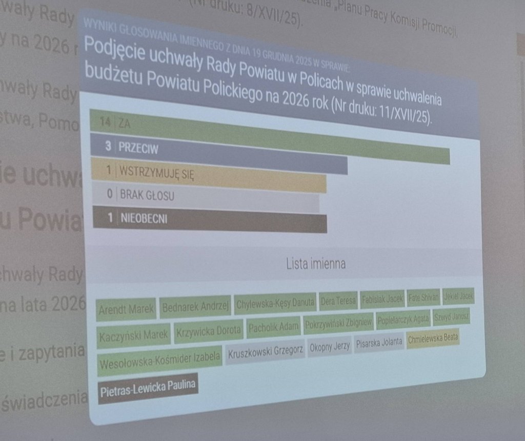 Podczas XVII sesji Rady Powiatu w Policach radni uchwalili Budżet Powiatu Polickiego na 2026 rok. Dochody wyniosły 179 598 626,63 zł, wydatki 192 503 049,60 zł, w tym inwestycje 35 129 794,52 zł. Wydatki inwestycyjne obejmują m.in. drogi i infrastrukturę powiatową, edukację i jednostki oświatowe, wsparcie społeczne i administrację, bezpieczeństwo i transport, cyberbezpieczeństwo i technologie oraz programy społeczne i inne inwestycje komunalne.