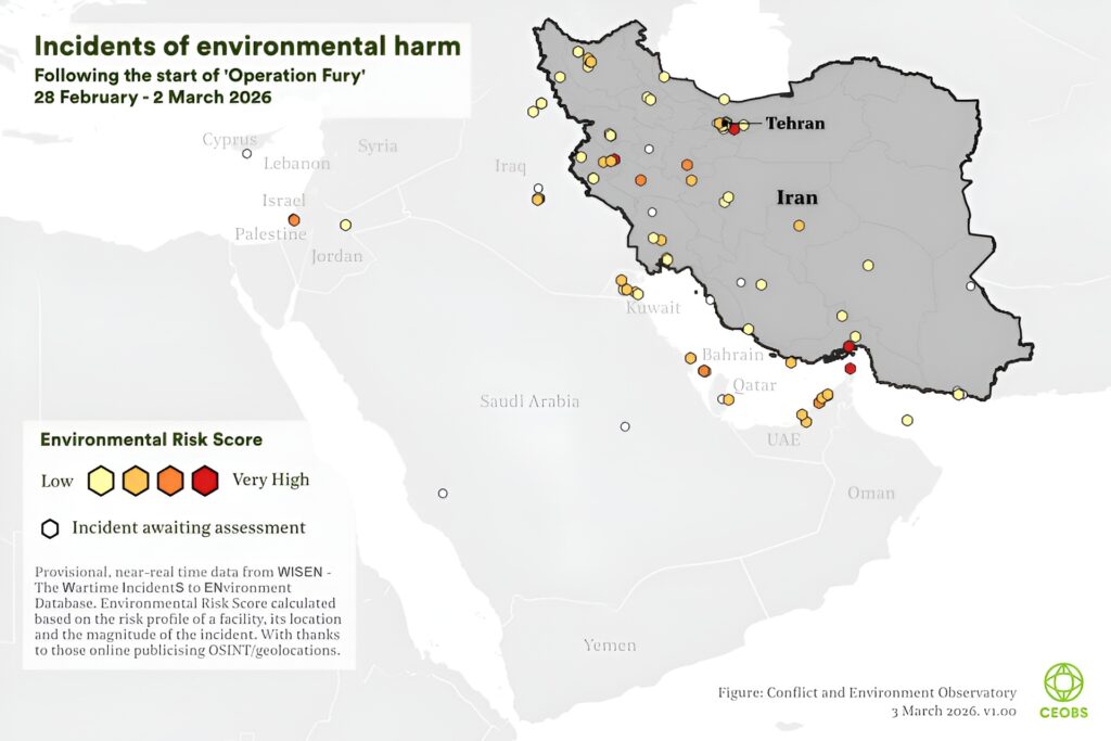 Choć obecna operacja przeciwko reżimowi w Iranie ma inny charakter niż wojna w Ukrainie czy działania w Strefie Gazy, już teraz można mówić o szkodach środowiskowych. Zajmuje się tym Conflict and Environment Observatory (CEOBS), czyli Obserwatorium Konfliktów i Środowiska. Organizacja bada i dokumentuje wpływ konfliktów zbrojnych na środowisko naturalne, żeby zwrócić uwagę na szkody środowiskowe powstające w wyniku wojen. W ciągu pierwszych trzech dni walk na Bliskim Wschodzie CEOBS zidentyfikowało 120 incydentów związanych z różnego rodzaju szkodami środowiskowymi.