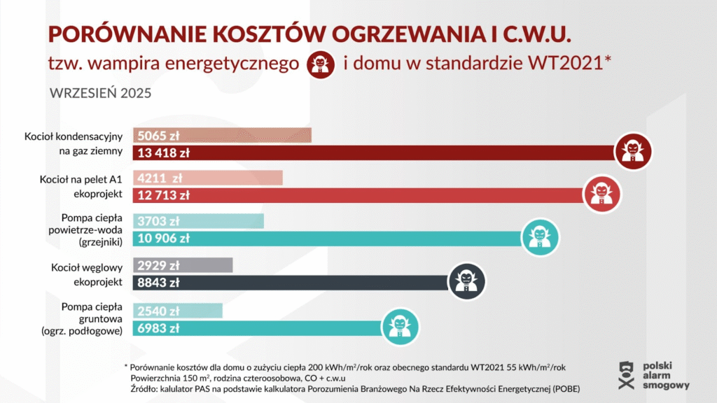 Polski Alarm Smogowy sprawdził roczne koszty ogrzewania domów w Polsce, posługując się najnowszymi cenami paliw i nośników energii z września 2025 roku. Organizacja pozyskała dane z dwóch składów opałów w każdym województwie – w sumie pytając 32 różne przedsiębiorstwa.