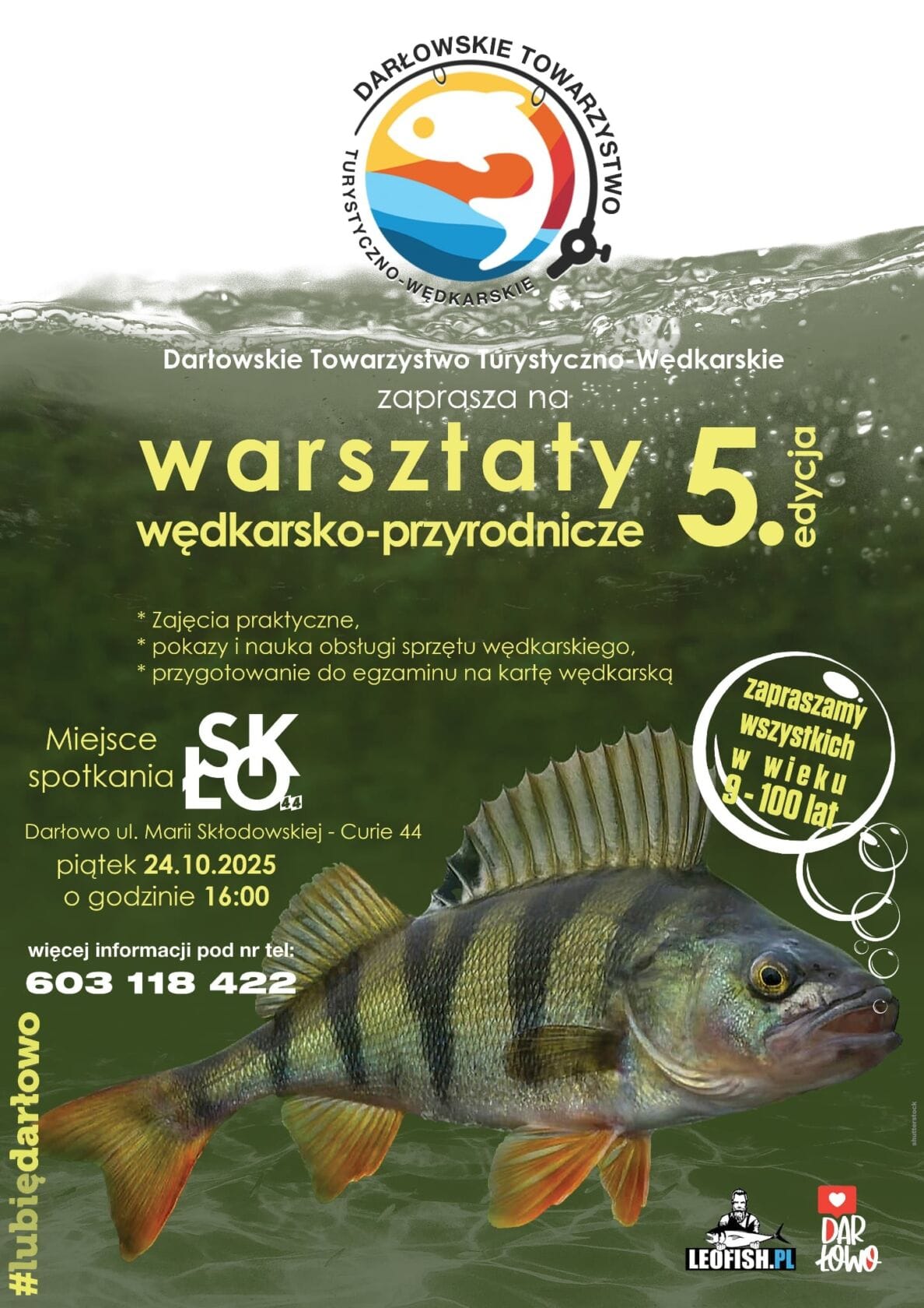 Serdecznie zapraszamy na kolejne spotkanie piątej edycji Warsztatów wędkarsko – przyrodniczych. Na spotkaniach będą zajęcia praktyczne, pokazy i nauka obsługi sprzętu wędkarskiego, przygotowanie do egzaminu na kartę wędkarską.