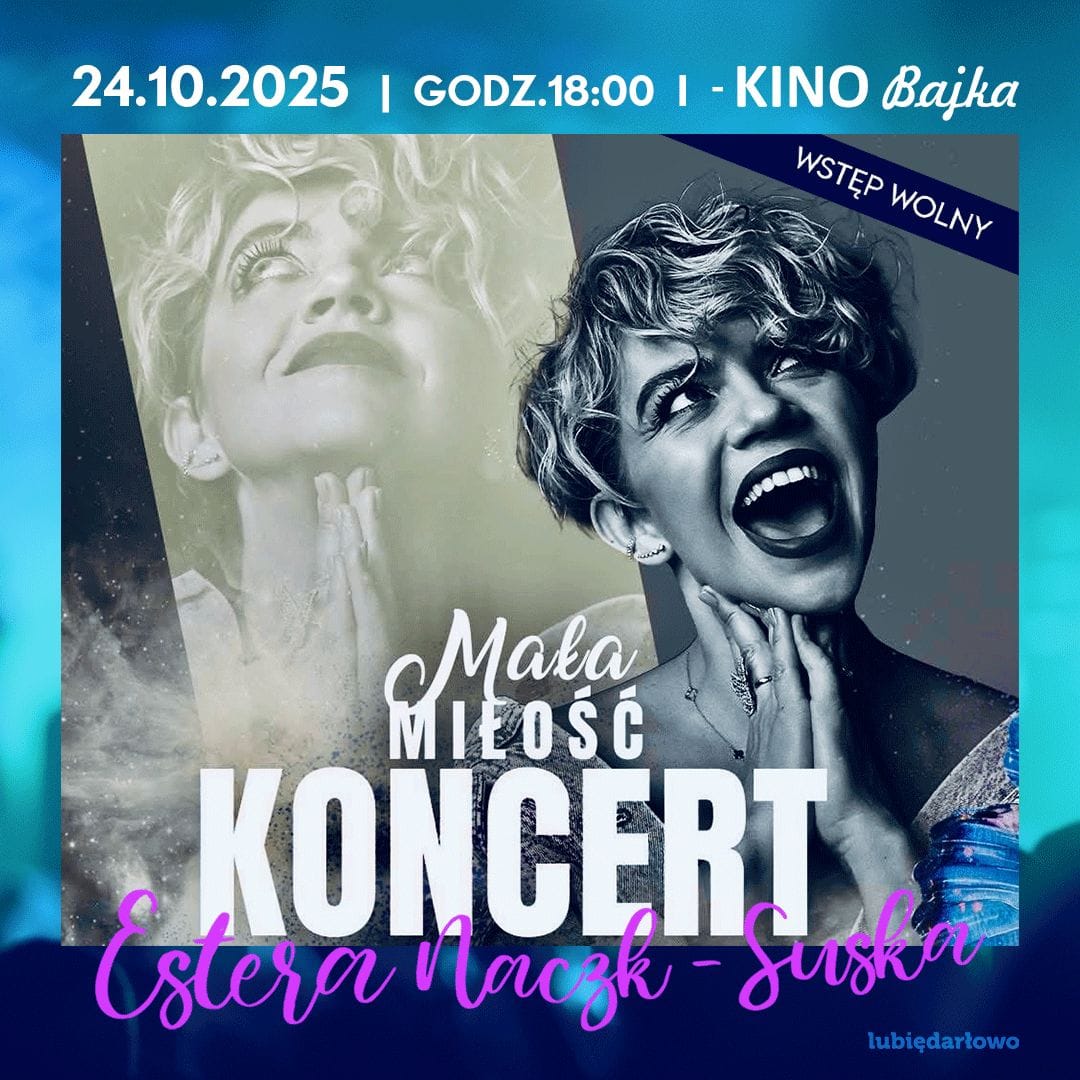 Burmistrz Darłowa, Miasto Darłowo i Darłowski Ośrodek Kultury serdecznie zapraszają na koncert pt.: MAŁA MIŁOŚĆ w wykonaniu Estery Naczk-Suskiej. To wydarzenie muzyczne powiązane jest z premierą najnowszej płyty wydanej pod tym samym tytułem, którą Artystka stworzyła wspólnie z Marcinem Górnym i Jackiem Piskorzem. Podczas koncertu w Darłowie Esterze Naczk- Suskiej towarzyszył będzie Jacek Piskorz (piano) oraz wspaniałe głosy towarzyszące Aleksandry Tockiej, Judyty Pisarczyk i Karoliny Błachnia.