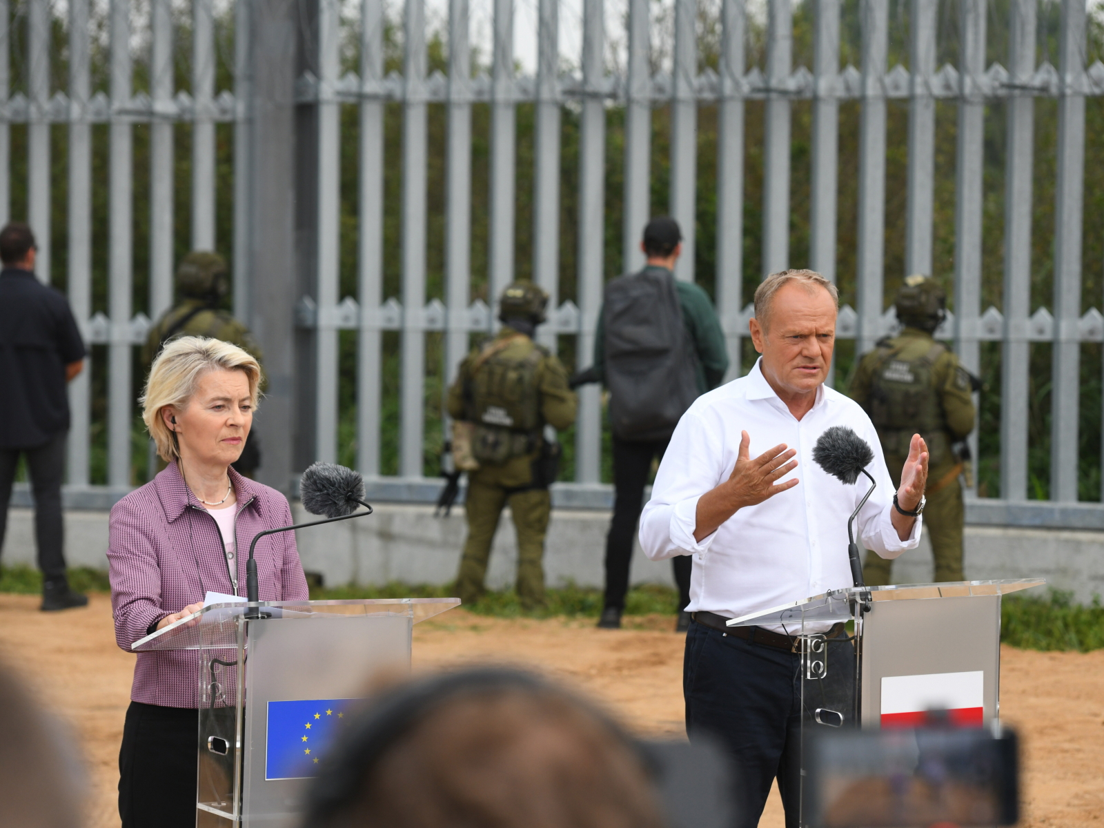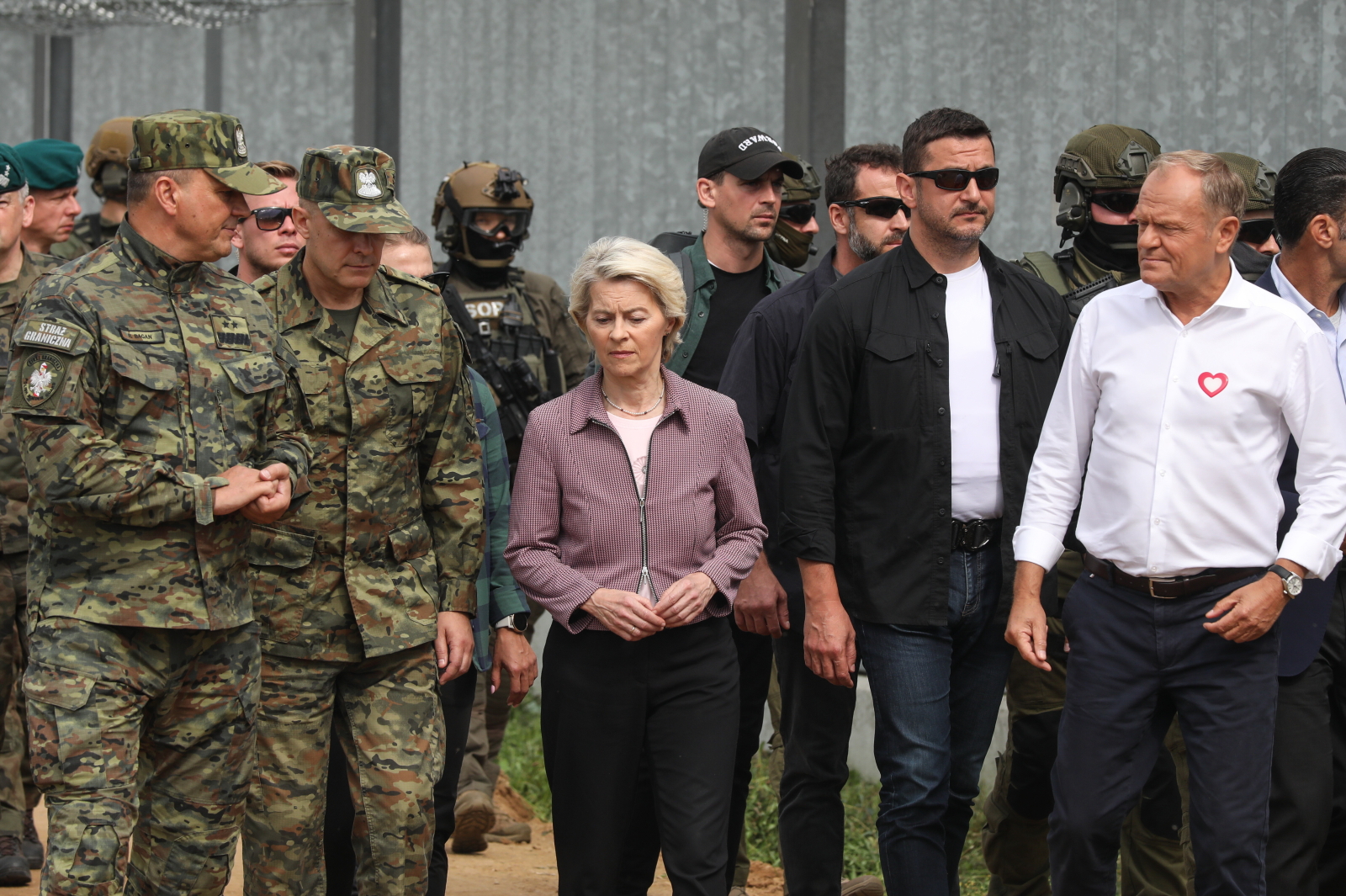 Konieczna jest zdecydowana postawa wobec polityki Rosji – podkreślali premier Donald Tusk i szefowa KE Ursula von der Leyen, którzy w niedzielę wizytowali odcinek polsko-białoruskiej granicy. Gdy oglądali zmodernizowaną stalową zaporę, po drugiej stronie granicy pojawiły się służby białoruskie z bronią – podeje Polska Agencja Prasowa.