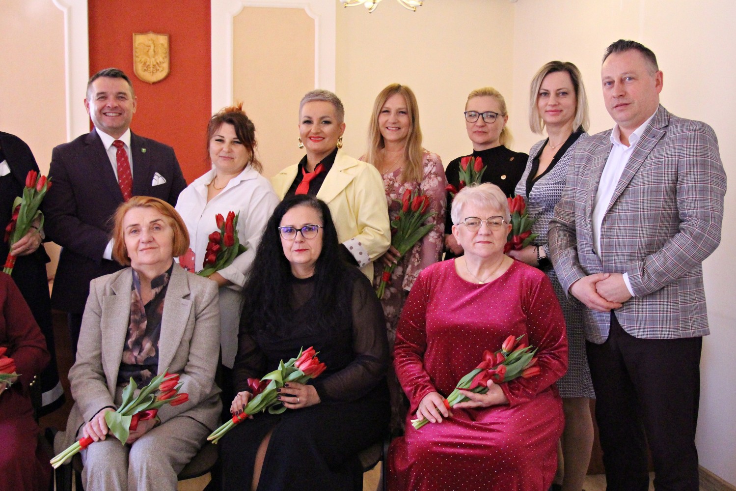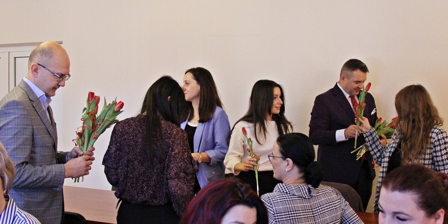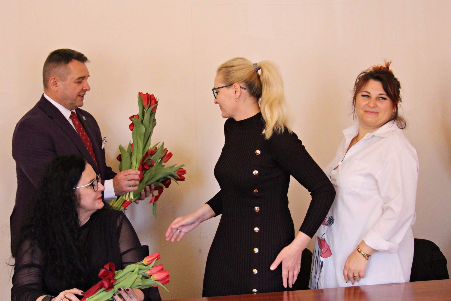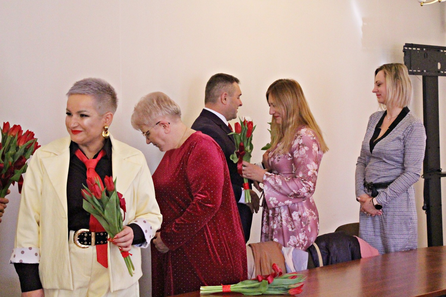 – „Miejsce kobiety jest w kuchni…” – zaczął Artur Pizoń – Starosta Janowski… Co?! Po sali przeszedł szmer… – „gdzie ma siedzieć sobie wygodnie, popijać wino i przyglądać się, jak mąż gotuje obiad”. O! – dokończył… To już lepiej… – „A kobiety wychodzą często za mąż lub… giną w wypadku” – kontynuował półżartem, z kwiatkiem… Kwiaty i życzenia paniom składali również dwaj inni panowie – Sławomir Dworak – Członek Zarządu Powiatu i Grzegorz Krzysztoń – Sekretarz Powiatu. Panowie byli zabawni i mili tego 6. marca 2026 Anno Domini…