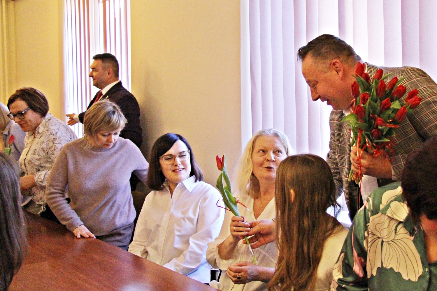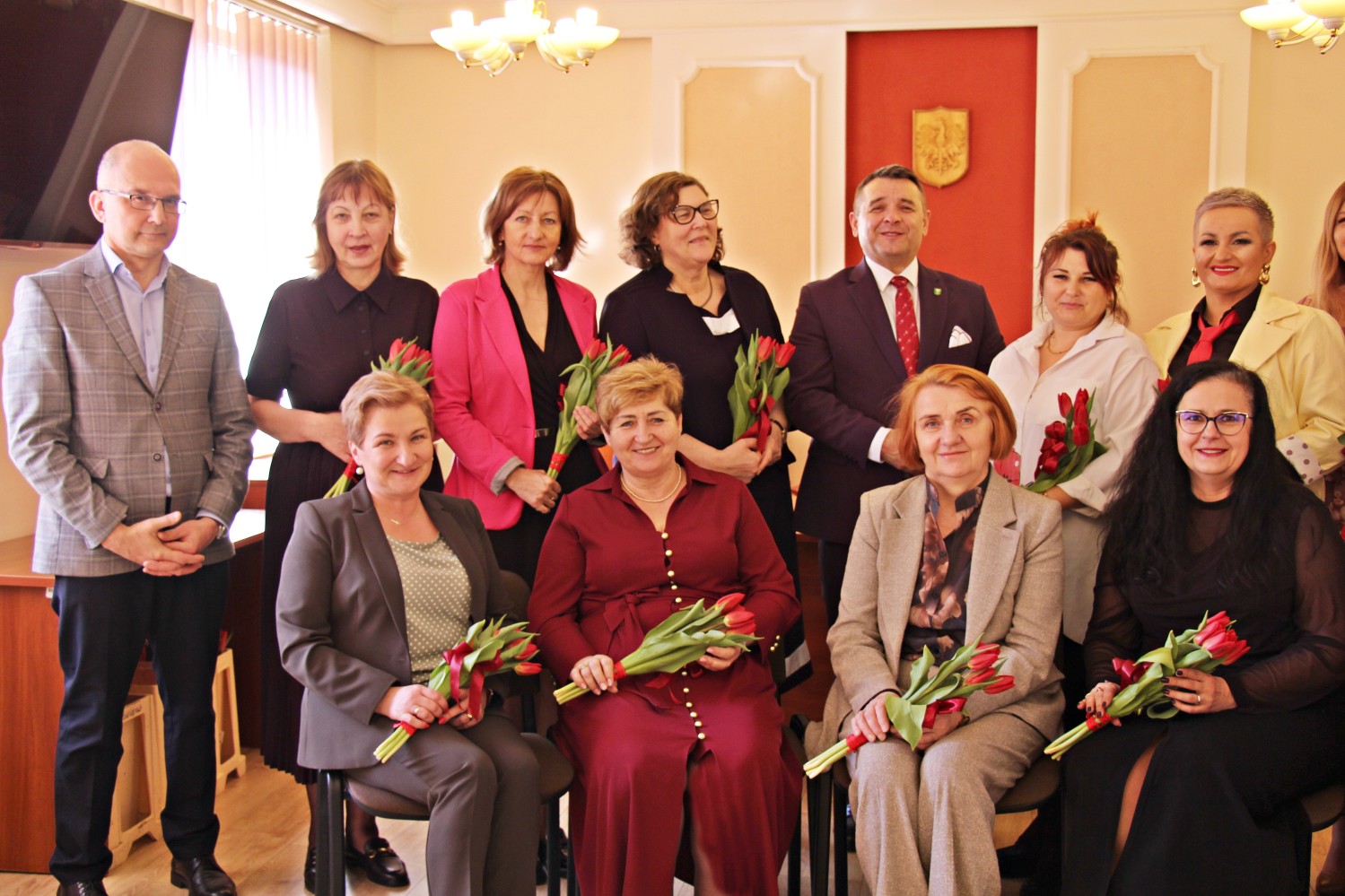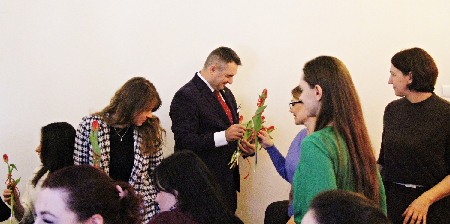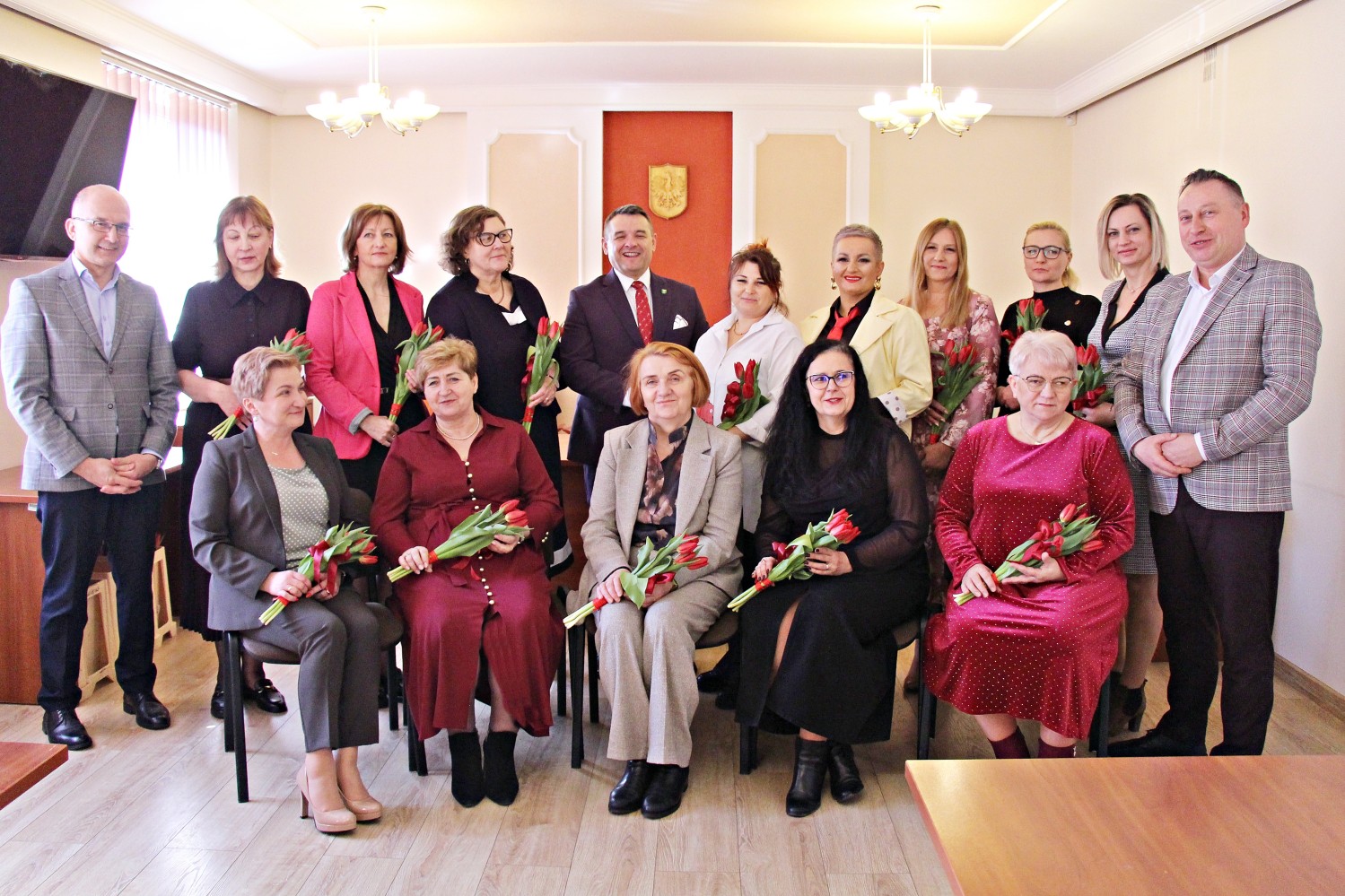 – „Miejsce kobiety jest w kuchni…” – zaczął Artur Pizoń – Starosta Janowski… Co?! Po sali przeszedł szmer… – „gdzie ma siedzieć sobie wygodnie, popijać wino i przyglądać się, jak mąż gotuje obiad”. O! – dokończył… To już lepiej… – „A kobiety wychodzą często za mąż lub… giną w wypadku” – kontynuował półżartem, z kwiatkiem… Kwiaty i życzenia paniom składali również dwaj inni panowie – Sławomir Dworak – Członek Zarządu Powiatu i Grzegorz Krzysztoń – Sekretarz Powiatu. Panowie byli zabawni i mili tego 6. marca 2026 Anno Domini…