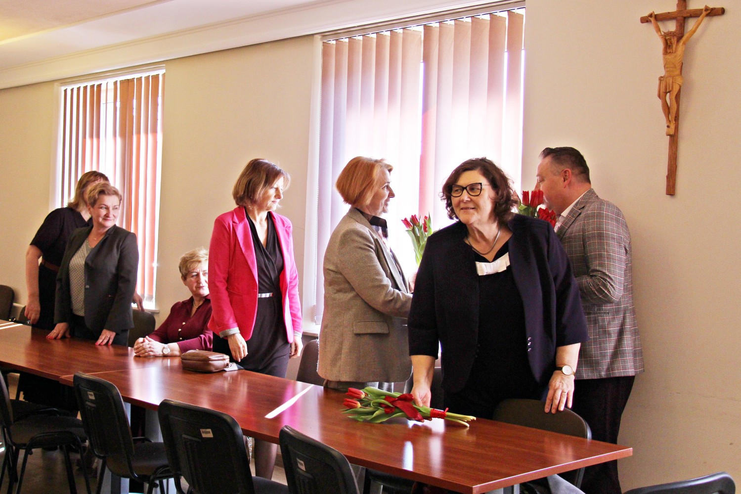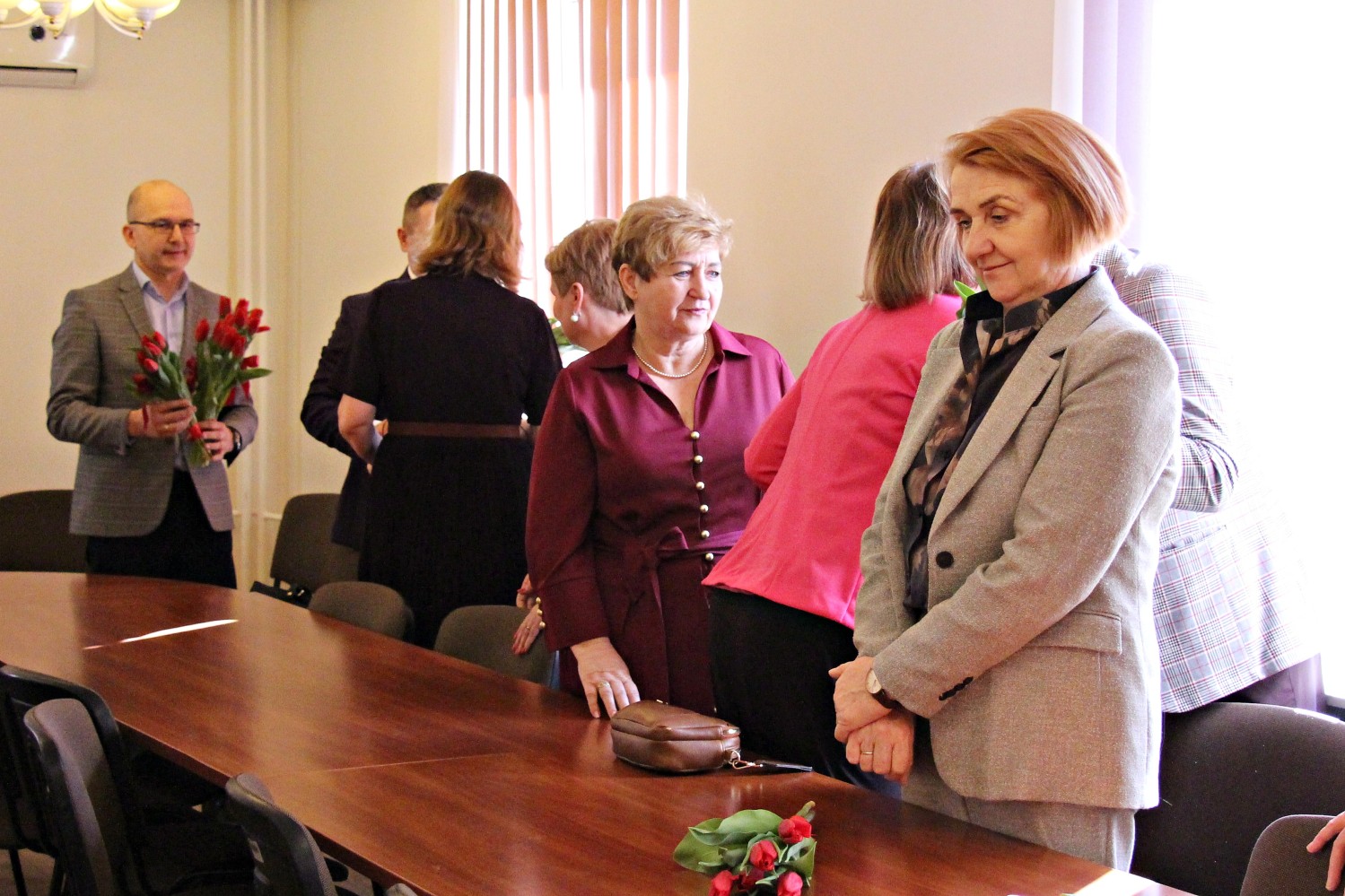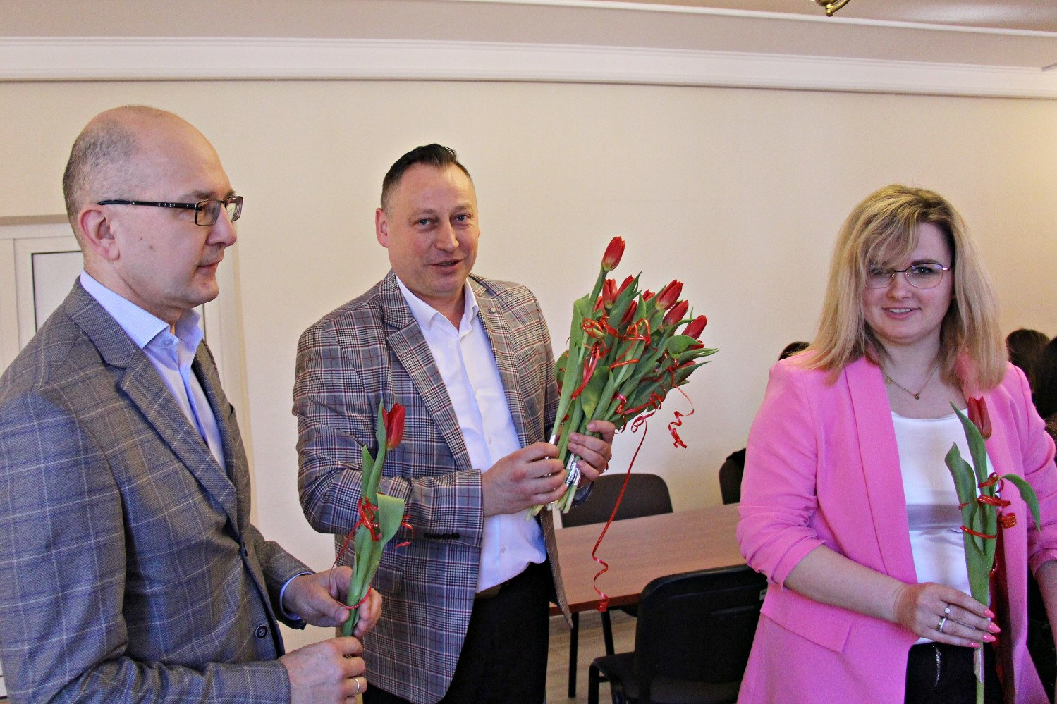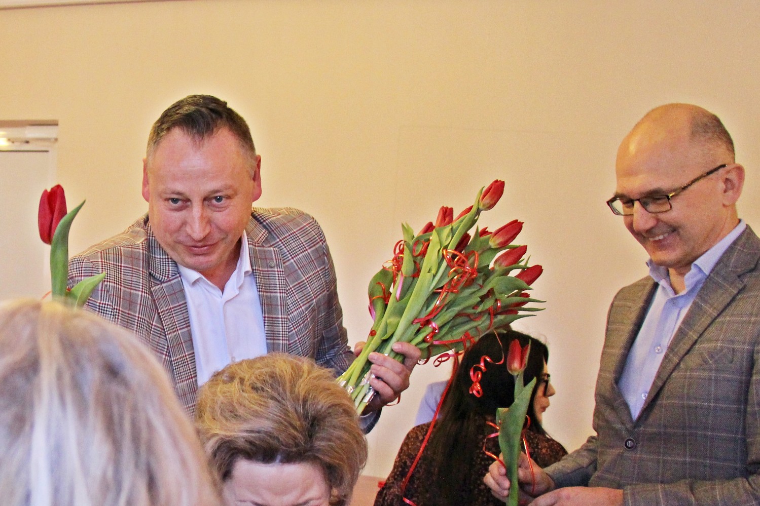 – „Miejsce kobiety jest w kuchni…” – zaczął Artur Pizoń – Starosta Janowski… Co?! Po sali przeszedł szmer… – „gdzie ma siedzieć sobie wygodnie, popijać wino i przyglądać się, jak mąż gotuje obiad”. O! – dokończył… To już lepiej… – „A kobiety wychodzą często za mąż lub… giną w wypadku” – kontynuował półżartem, z kwiatkiem… Kwiaty i życzenia paniom składali również dwaj inni panowie – Sławomir Dworak – Członek Zarządu Powiatu i Grzegorz Krzysztoń – Sekretarz Powiatu. Panowie byli zabawni i mili tego 6. marca 2026 Anno Domini…
