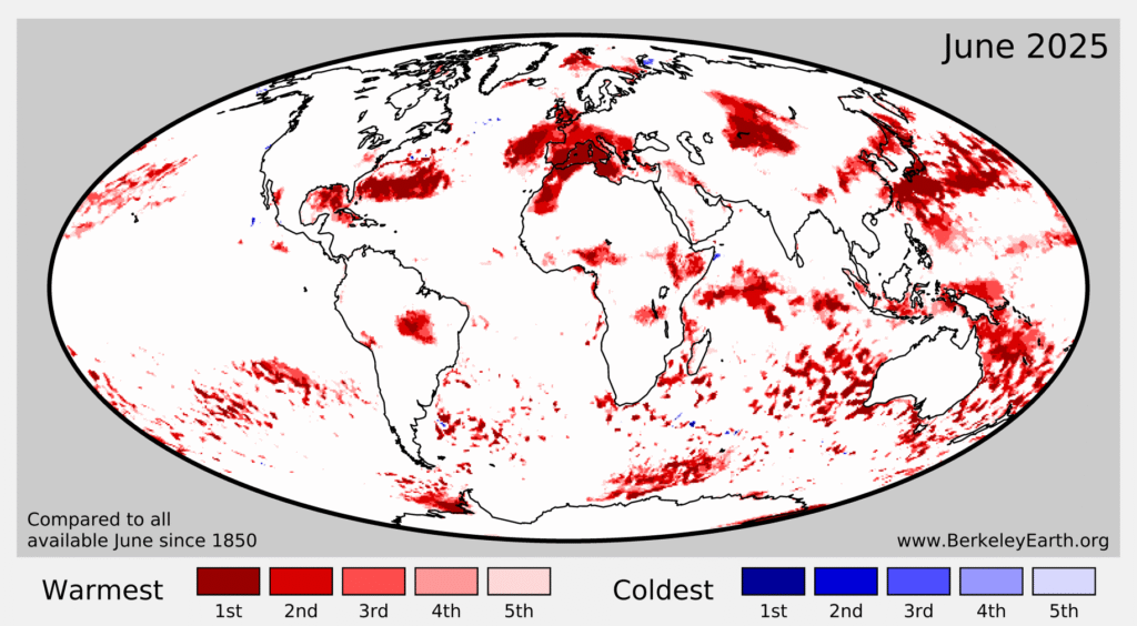 Mapa pokazująca jak ciepły był czerwiec w roku 2025 względem wszystkich innych czerwców od roku 1850. Odcienie koloru czerwonego obrazują pięć najwyższych pozycji w rankingu, a najciemniejszy odcień oznacza iż czerwiec w tych miejscach planety rekordowo ciepły. Analogicznie, odcienie koloru niebieskiego pokazują temperatury bliskie najzimniejszemu czerwcowi w historii obserwacji.