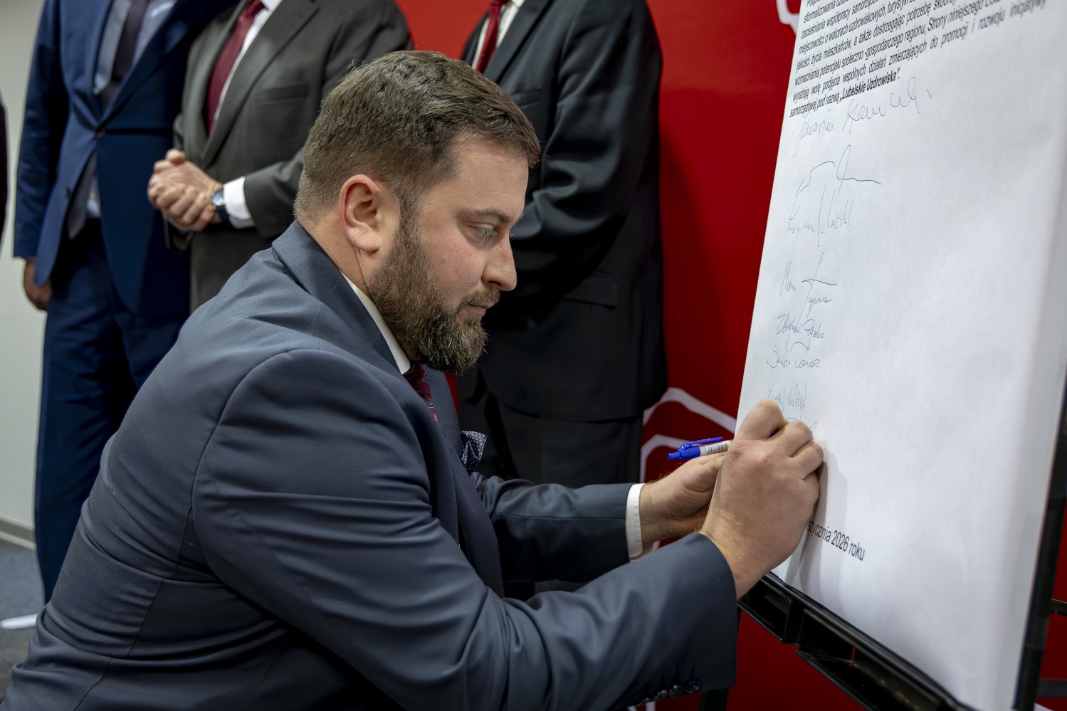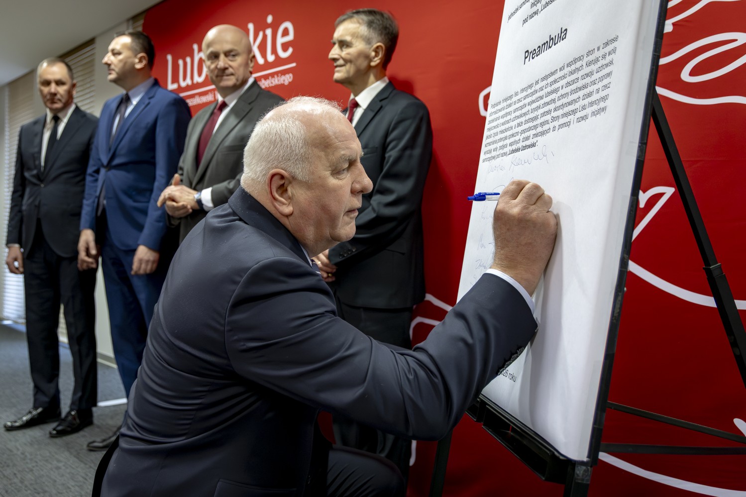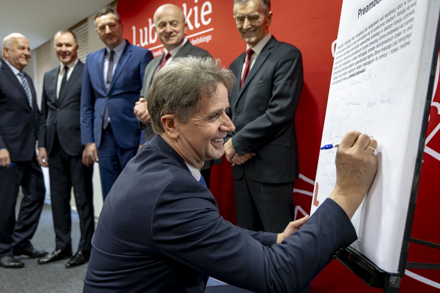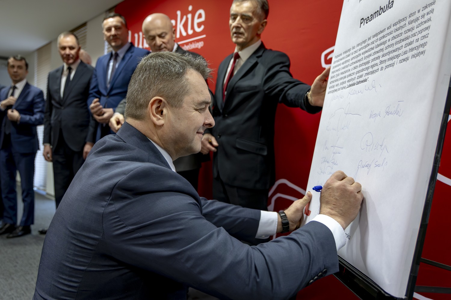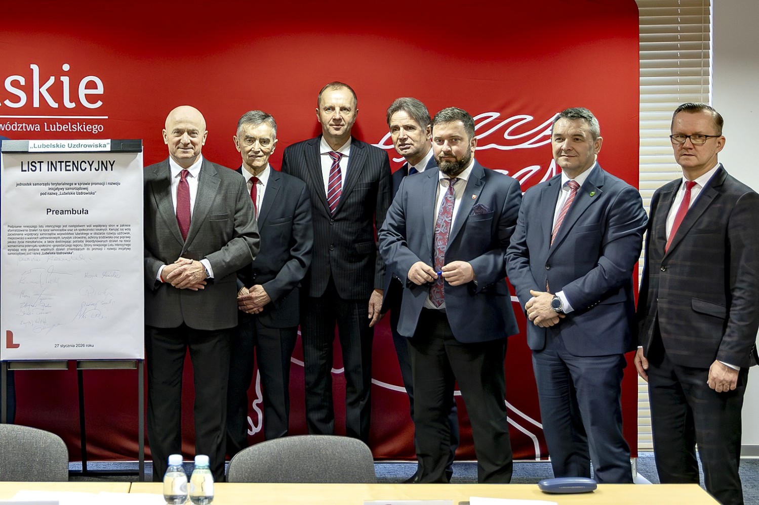 Na grupowym zdjęciu (od lewej): Zbigniew Pyczko – Wójt Biszczy, Andrzej Szarlip – Starosta Biłgorajski, Stanisław Kozyra – Wójt Łukowa, Marcin Łaguna – Burmistrz Wąwolnicy, Kazimierz Misztal – Burmistrz Krasnobrodu, Wiesław Pardyka – Burmistrz Nałęczowa, Jarosław Stawiarski – Marszałek Województwa Lubelskiego, Bogdan Kawałko – Dyrektor Departamentu Strategii i Rozwoju Urzędu Marszałkowskiego w Lublinie, Krzysztof Kołtyś – Burmistrz Janowa, Krzysztof Rusztyn – Wicestarosta Zamojski, Łukasz Skowyra – Członek Zarządu Powiatu w Puławach, Artur Pizoń – Starosta Janowski, Tomasz Skroban – Sekretarz Gminy Susiec.