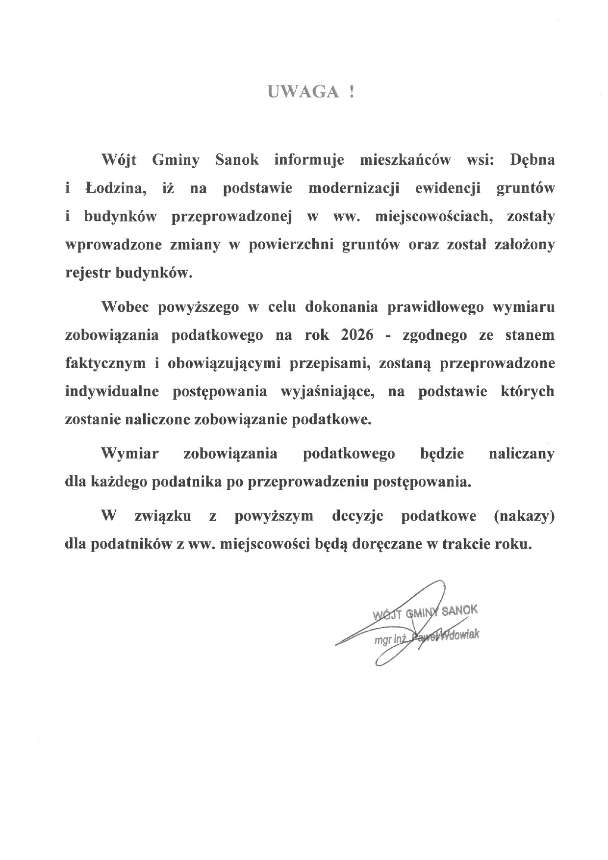 Istotną informacją dla mieszkańców jest fakt, iż decyzje podatkowe (tzw. nakazy) dla podatników z tych miejscowości nie zostaną doręczone jednorazowo na początku roku, jak ma to miejsce zazwyczaj. Z uwagi na prowadzoną procedurę wyjaśniającą, decyzje będą przekazywane sukcesywnie, w trakcie roku.
