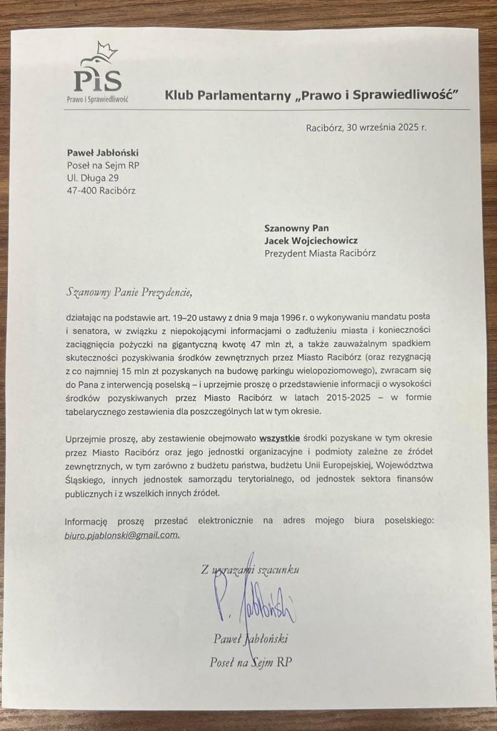 Poseł Prawa i Sprawiedliwości Paweł Jabłoński zwrócił się z interwencją poselską do prezydenta Jacka Wojciechowicza, by skontrolować finanse miasta Racibórz, bo – jak podkreśla – w miejskiej kasie są pustki, a wiele inwestycji nie zostało zrealizowanych. O komentarz w tej sprawie poprosiliśmy samego posła: