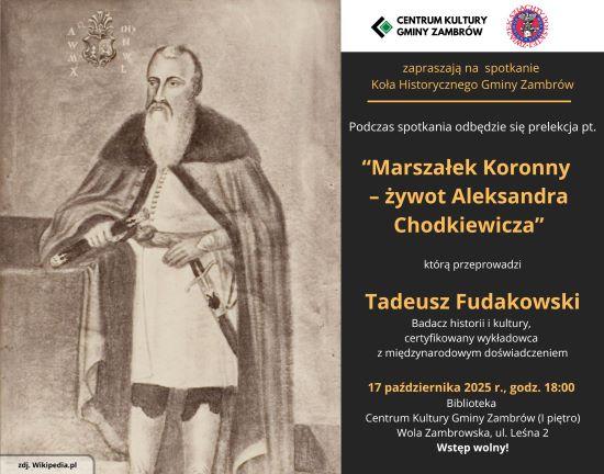 Na najbliższym spotkaniu Koła Historycznego Gminy Zambrów Tadeusz Fudakowski przeprowadzi prelekcję pt. "Marszałek Koronny - żywot Aleksandra Chodkiewicza". Na październikowym spotkaniu Koła Historycznego Gminy Zambrów odbędzie się prelekcja pt. "Marszałek Koronny - żywot Aleksandra Chodkiewicza", która będzie poświęcona tej wybitnej, choć zapomnianej dziś postaci, która odegrała kluczową rolę w doprowadzeniu Rzeczpospolitej do stabilności i dobrobytu. Ten wybitny polityk współpracował z takimi postaciami jak król Zygmunt I Stary, królowa Bona Sforza czy Mikołaj Kopernik. Prelekcję przeprowadzi Tadeusz Fudakowski - mieszkaniec Białegostoku, badacz historii i kultury oraz wykładowca z międzynarodowym doświadczeniem.