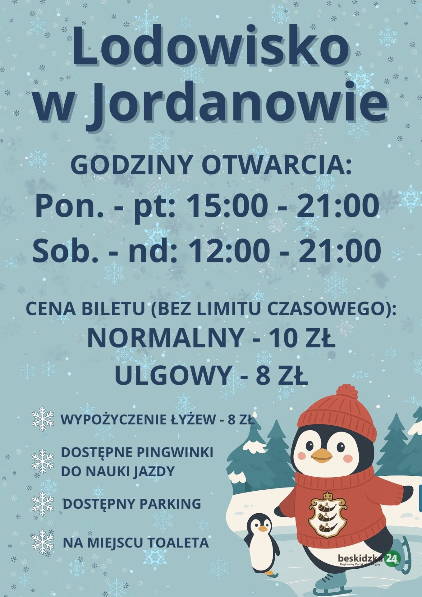 Od poniedziałku do piątku lodowisko będzie czynne w godzinach 15.00 – 21.00, a w soboty i niedziele od 12.00 do 21.00.
