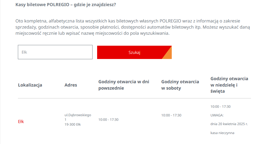 - w Ełku POLREGIO prowadzi własną kasę biletową,