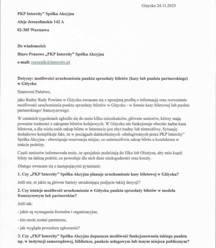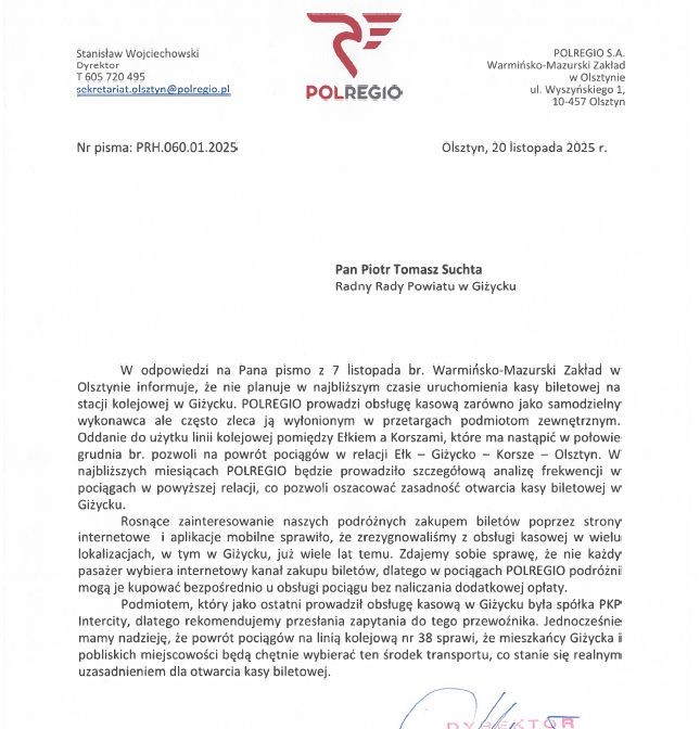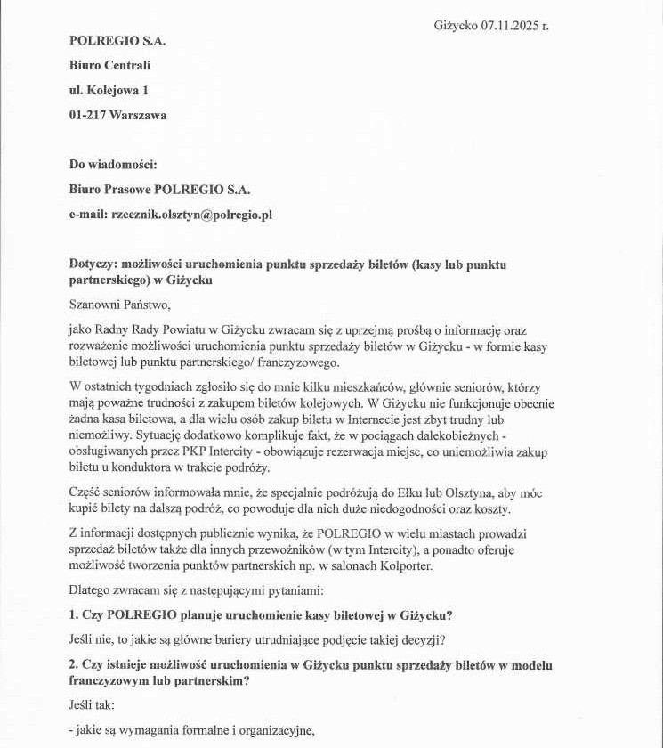W listopadzie zgłosili się do mnie seniorzy z Giżycka. Przedstawili ten problem z zupełnie innej perspektywy – osób, które nie zawsze odnajdują się w cyfrowym świecie. Dla wielu, zwłaszcza starszych mieszkańców, tradycyjny kontakt i fizyczny bilet w ręku wciąż mają ogromne znaczenie.