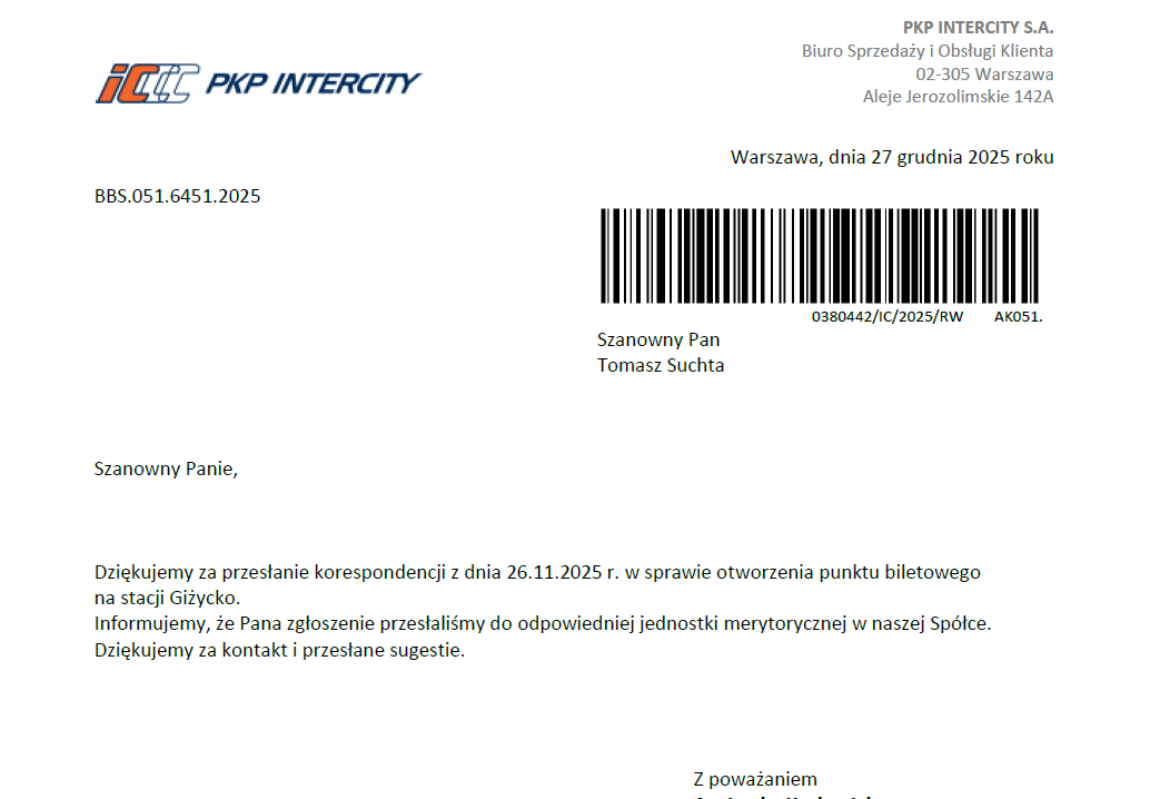 PKP Intercity wciąż analizuje sprawę. Odpowiedź z końca grudnia to jedynie informacja o przekazaniu pisma do „jednostki merytorycznej”. Od tamtej pory – cisza.