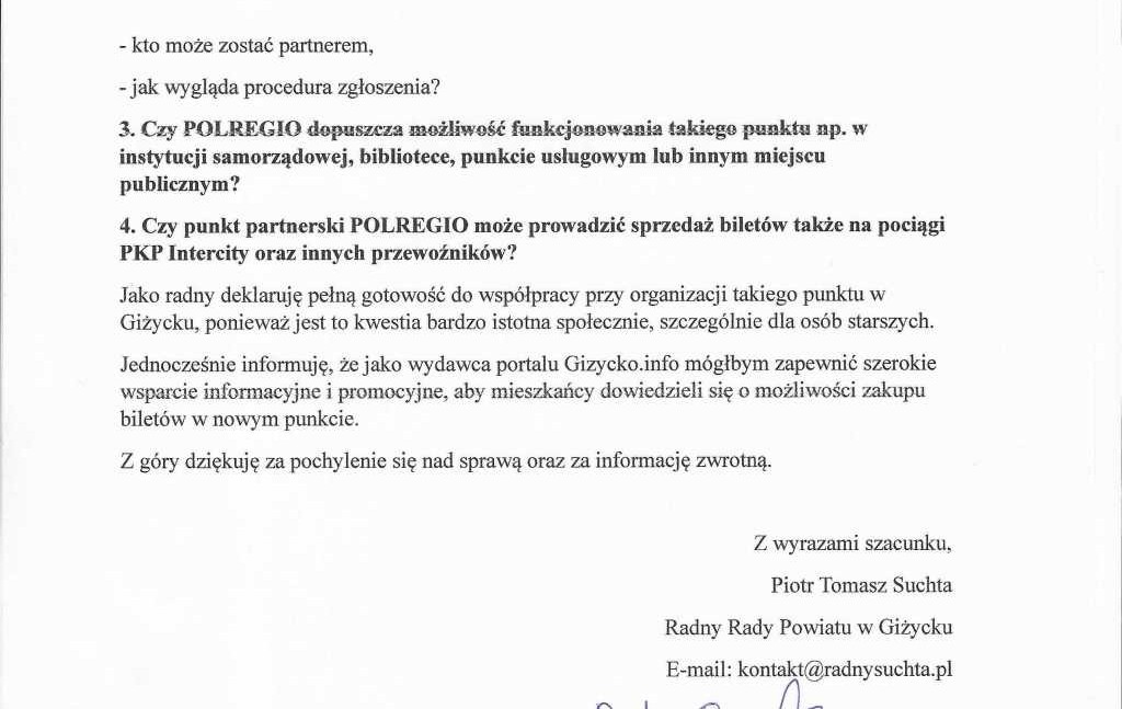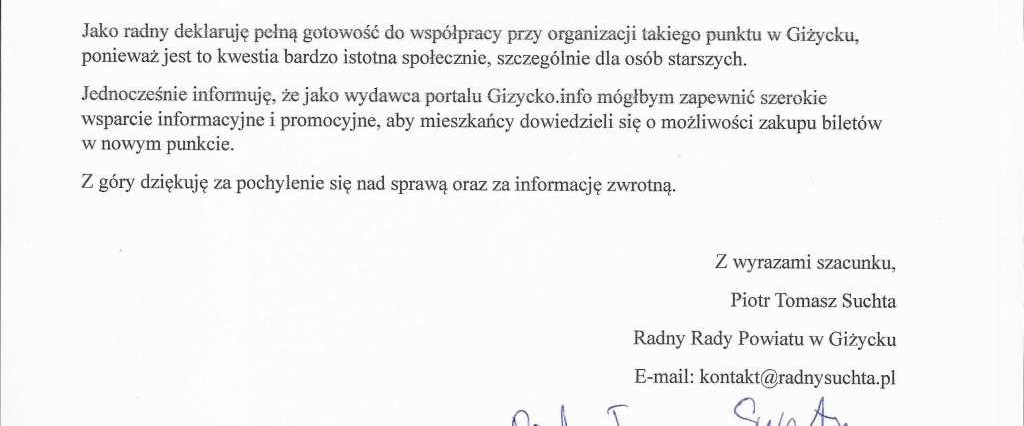 Rozmawiałem z Wicestarostą Giżyckim o rozwiązaniach alternatywnych – np. miejscu, w którym można uzyskać pomoc przy zakupie biletu. Jedną z moich propozycji było Centrum Informacji Turystycznej, choć możliwe są też inne lokalizacje.