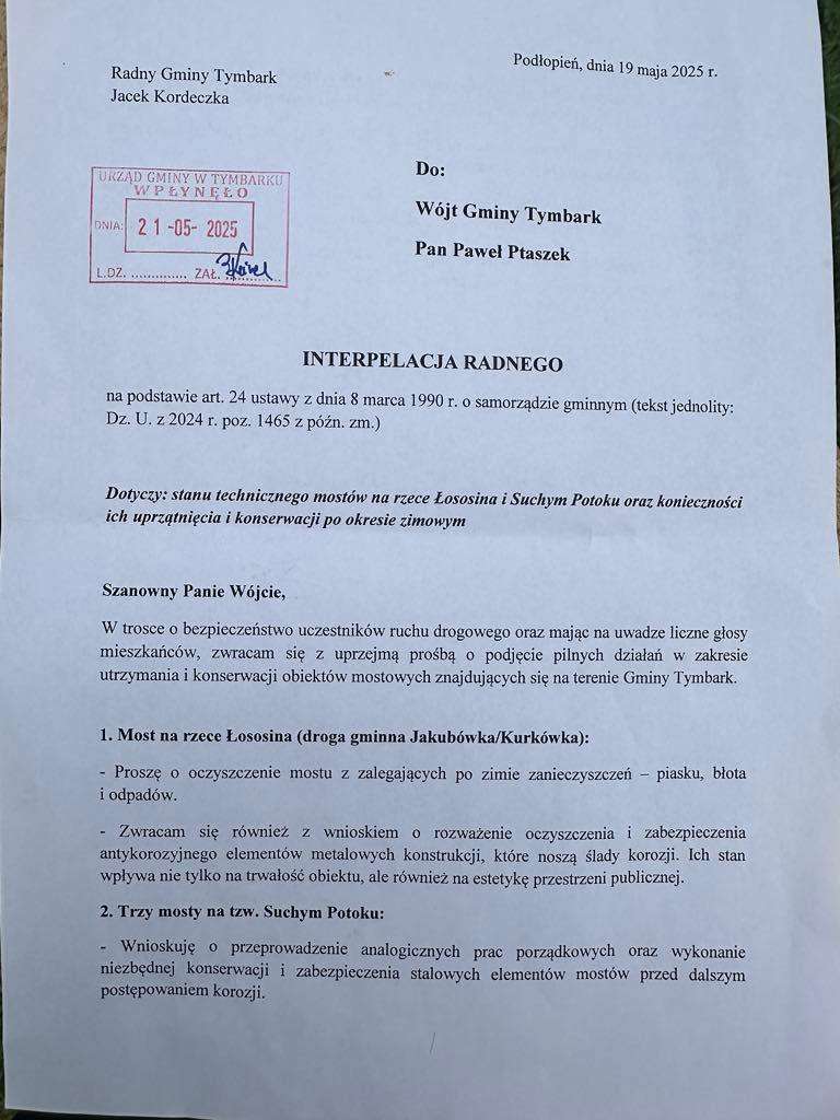 Codziennie przechodzicie przez te mostki. Codziennie jeździcie tą drogą. I codziennie mijacie te same wystające pręty zbrojeniowe, błoto, zniszczone płyty. To nie jest sprawa radnego — to jest sprawa mieszkańców. Dlatego dziś mówię jasno: ta odpowiedź z urzędu nie była skierowana do mnie. Ona była skierowana do Was. Bo tu nie chodzi o wielkie inwestycje — chodzi o elementarną troskę o bezpieczeństwo. O to, by pieszy nie skaleczył się o wystające zbrojenie. By most wyglądał jak część wspólnej przestrzeni publicznej, a nie jak zapomniany fragment infrastruktury. Pręty zbrojeniowe wystają bezpośrednio z jezdni. To realne zagrożenie — nie tylko dla pieszych, ale i dla kierowców. Najechanie na taki element może doprowadzić do uszkodzenia pojazdu, a w skrajnych przypadkach choćby do wypadku. Te mostki nie zardzewiały w tym roku. To efekt wieloletnich zaniedbań. A mimo to 8 maja na oficjalnym profilu Gminy Tymbark pojawił się kolorowy post: „Uwaga! realizowane są pozimowe naprawy dróg”. Wśród wymienionych lokalizacji — Podłopień. Tyle iż właśnie tam, na tych mostkach, od miesięcy nikt nie zrobił nic. Tymczasem do prac została powołana komisja, która miała jeździć, oceniać i wskazywać potrzeby. jeżeli choćby ten zespół nie był w stanie zidentyfikować tak rażących zaniedbań — lub nie potrafił ich egzekwować — to znaczy, iż nadzór nad nim był nieskuteczny. Bo jeżeli nie potrafi się zarządzać choćby komisją, to jak zarządzać gminą? Czekałem spokojnie jako radny, dając czas na reakcję. Skierowałem interpelację. Bo nie da się już dłużej udawać, iż problem nie istnieje. A jeżeli ktoś nie wie, skąd wziąć parę litrów farby antykorozyjnej, ani kto miałby pomalować przerdzewiałe poręcze, to znaczy, iż zwyczajnie nie nadaje się do pełnienia swojej funkcji. Jedna koncepcja mniej, jeden „planik” mniej — i wystarczyłoby na farbę. A może jeszcze jedna zbędna audycja radiowa mniej — i wreszcie byłoby widać efekt w terenie, a nie tylko w eterze. Niech mieszkańcy sami ocenią. Niech spojrzą na te mostki. Niech porównają je z komunikatami o „naprawach”. Niech odpowiedzą sobie na pytanie, czy naprawdę zasługujemy na więcej niż tylko ładne słowa na Facebooku. A skoro — jak się okazuje — na wysprzątanie i wymalowanie czterech małych mostków potrzeba 40 tysięcy złotych, to może rzeczywiście nie powinno nas dziwić, iż na remont rynku i budynku gminy idą setki tysięcy. Tylko czy tak proste zadanie musi być aż tak wielkim problemem? I wreszcie pojawia się pytanie, które powinno paść już dawno: Jaki naprawdę jest dziś stan finansów gminy Tymbark? Bo jeżeli brakuje środków na porządek i podstawowe utrzymanie infrastruktury — jeżeli nie da się znaleźć pieniędzy choćby na parę litrów farby — to na co tak naprawdę są one wydawane? I właśnie dlatego jest referendum. Bo ta odpowiedź, to niedziałanie, ta obojętność — są jego najlepszym uzasadnieniem. Gdyby było inaczej, nie trzeba byłoby pisać interpelacji w sprawach tak oczywistych. A jeżeli ktoś w odpowiedzi na rzeczowy wniosek radnego potrafi jedynie odbić piłeczkę kąśliwym komentarzem albo złośliwym formalizmem, to tym bardziej widać, iż stracił kontakt z mieszkańcami i ich realnymi problemami. To typ wójta odporny na rzeczywistość, ale wyczulony na krytykę. Cechuje go rzadki dar — potrafi przejść obojętnie obok problemu, ale nigdy obok pytania, które go demaskuje.