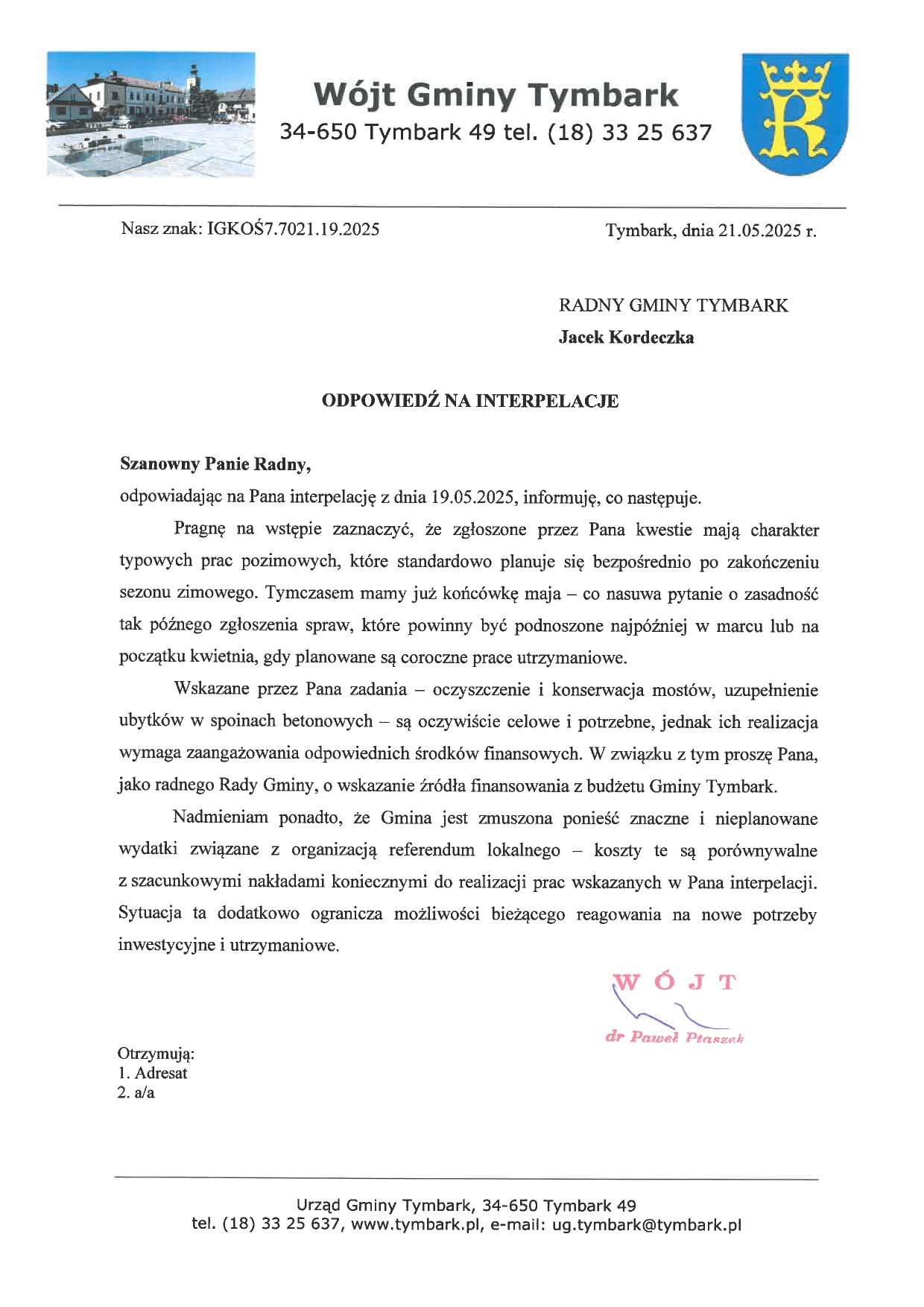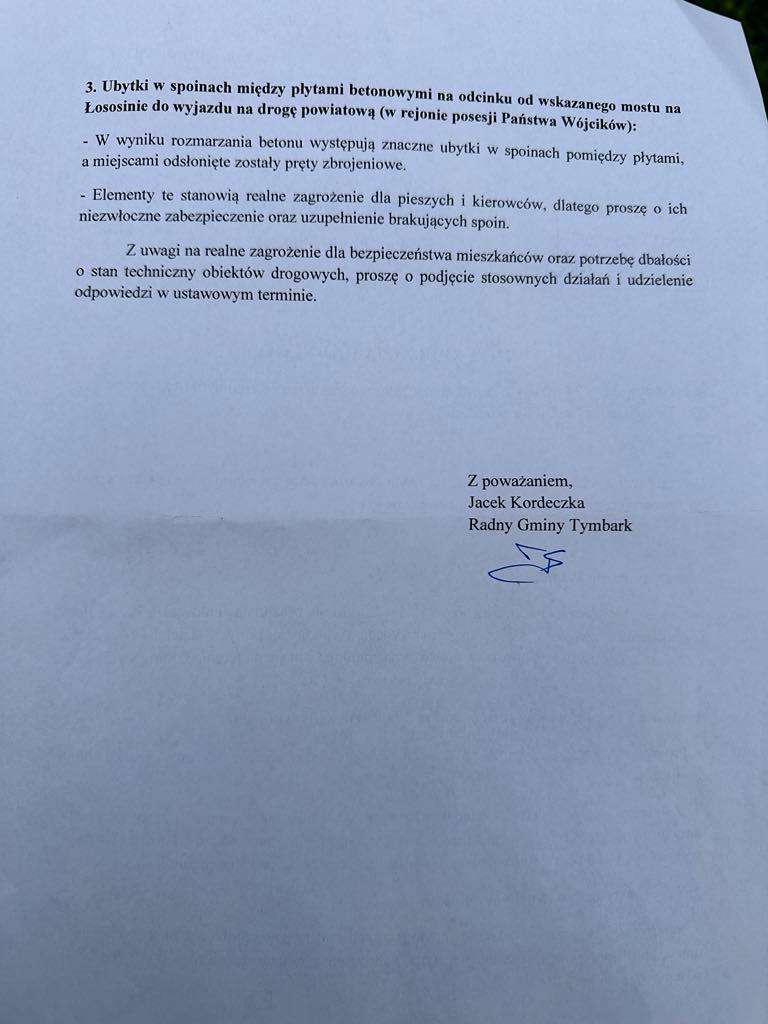 … przesyłając scan swojej interpelacji w sprawie wykonania bieżących napraw mostu w Podłopieniu nad rzeką Łososiną. Dołączył też odpowiedź Wójta Gminy Tymbarka Pawła Ptaszka.