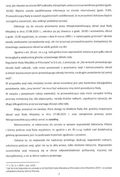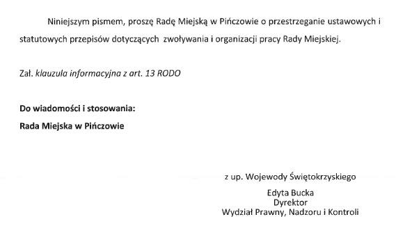 W oficjalnej odpowiedzi, podpisanej przez Edytę Bucką – Dyrektor Wydziału Prawnego, Nadzoru i Kontroli – Wojewoda Świętokrzyski zwrócił się do Rady Miejskiej w Pińczowie z prośbą o szczególną staranność przy organizacji kolejnych sesji. Zaznaczono, iż należy ściśle przestrzegać zarówno ustawowych, jak i statutowych procedur dotyczących zwoływania i prowadzenia obrad, w tym: