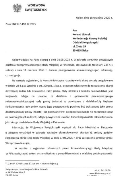 Wojewoda Świętokrzyski uznał za zasadne zarzuty dotyczące przebiegu sesji Rady Miejskiej w Pińczowie, która odbyła się 27 sierpnia 2025 roku. Skargę złożyli członkowie i sympatycy Konfederacji Korony Polskiej, wskazując na nieprawidłowości związane z godziną rozpoczęcia obrad oraz samowolnym zarządzeniem przerwy przez wiceprzewodniczącą Rady – Martę Łaskawiec.