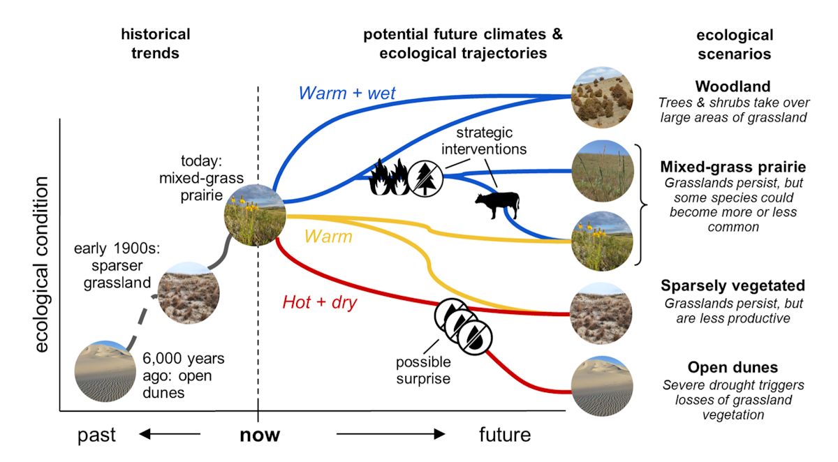 - Akceptacja niepewności ekologicznej: Zamiast polegać na jednym „najbardziej prawdopodobnym” wyniku dla ekosystemów w zmieniającym się klimacie, zarządcy mogą lepiej się przygotować, mapując wiele możliwości. W Sandhills w Nebrasce badamy, jak ta w większości nienaruszona, rodzima preria mogłaby się przekształcić w tak różne ekosystemy jak lasy, czy otwarte wydmy.