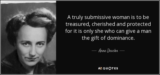 Dla kobiet miłość to zaufanie. Wzmacniają mężczyzn poprzez uległość. Feminizm oszukał je, by szukały władzy zamiast miłości. Sprawiał, iż kobiety bały się i rywalizowały z mężczyznami.