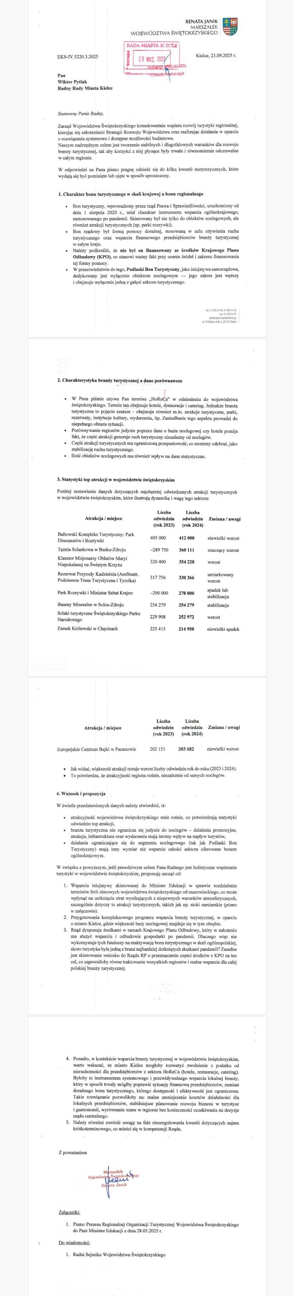 W odpowiedzi marszałek Renata Janik zwróciła uwagę, iż podobne programy – jak ogólnopolski bon turystyczny – były finansowane z budżetu państwa, a nie ze środków regionalnych. Podkreśliła także, iż turystyka w Świętokrzyskiem notuje systematyczny wzrost liczby odwiedzających, m.in. w Bałtowskim Kompleksie Turystycznym, Zamku Krzyżtopór czy Europejskim Centrum Bajki w Pacanowie. „Województwo świętokrzyskie stale rośnie, co potwierdzają statystyki odwiedzin w miejscach turystycznych” – napisała marszałek.