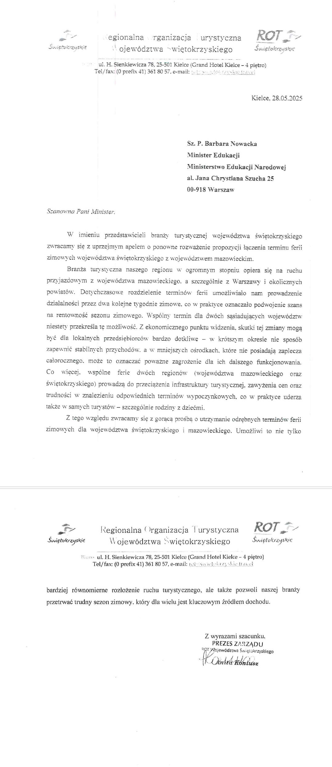 Do sprawy odniosła się również Regionalna Organizacja Turystyczna Województwa Świętokrzyskiego. W piśmie skierowanym do minister edukacji Barbary Nowackiej ROT podkreśliła znaczenie rozłożenia w czasie terminów ferii zimowych. Zdaniem organizacji, zbieżne ferie województw świętokrzyskiego i mazowieckiego mogłyby uderzyć w kondycję ekonomiczną branży. „Wspólny termin dla dwóch sąsiadujących województw niestety przekreśla tę możliwość” – zaznaczono w piśmie.