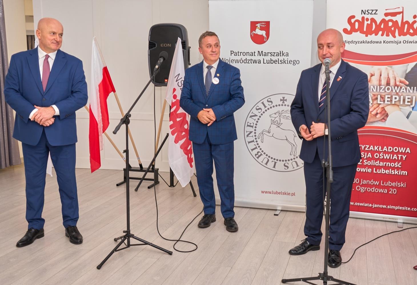 Dwóch Marszałków Województwa Lubelskiego w jednym czasie na tej samej uroczystości w powiecie janowskim trudno spotkać… Najczęściej, jest jeden albo drugi… A tu, proszę… Na zaproszenie Międzyzakładowej Komisji Oświaty NSZZ „Solidarność”, pojawili się obydwaj… I Jarosław Stawiarski i Piotr Breś… I to w sobotę… Czwartego października… W spotkaniu uczestniczyli także: Józef Michalczyk – przewodniczący kraśnickich struktur „Solidarności”, dwaj szefowie Związku Regionu Środkowo – Wschodniego (były i obecny) – Mieczysław Szczygieł i Marian Król, Zenon Zyśko – Wicestarosta Janowski i Krzysztof Kołtyś – Burmistrz Janowa. Byli też nauczyciele z oświatowej „Solidarności”, dyrektorzy jednostek powiatowych, przedstawiciele samorządu i kościoła oraz działacze „Solidarności”. A wszystkich było ze sto osób… Spora część z nich otrzymała odznaczenia i dyplomy uznania, podpisane i wręczane przez Stawiarskiego i Bresia. Medale Pamiątkowe Województwa Lubelskiego, przyznane przez Zarząd Województwa Lubelskiego, otrzymali: Andrzej Berezowski, Bogusław Czapla, Dariusz Dudzic, Piotr Góra, Adam Król, Tadeusz Piecyk, Józef Wieleba i Krzysztof Wilczyński. Dyplomy uznania odebrali: Eugeniusz Miś, Henryk Breś, Kamila Surowska, Krzysztof Kołtyś, Grzegorz Dudzic, Krystyna Ćwiek, Jan Moskal, Władysław Sowa, Marian Tyra, Czesław Moskal i Marian Pastucha Wyróżnienie przyznano też Międzyzakładowej Organizacji Związkowej NSZZ „Solidarność” i Międzyzakładowej Komisji Oświaty, której szefem jest Grzegorz Dudzic, a zastępcami – Anna Maria Hałabis i Iwona Bełdyk.