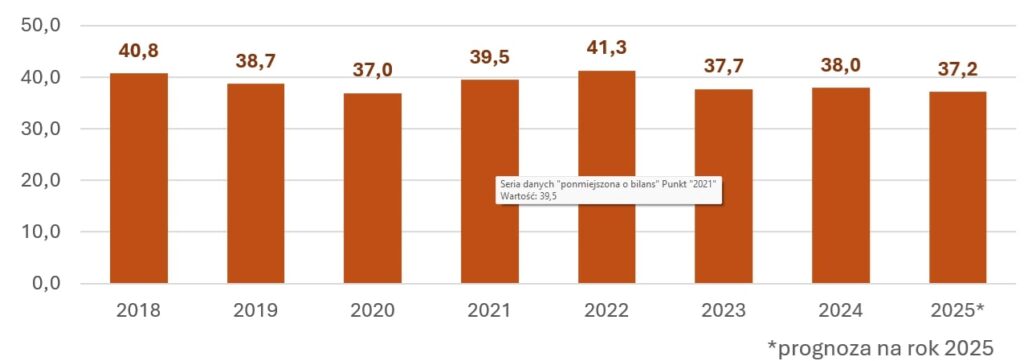 W całym analizowanym 2018-2024 r. średni poziom sprzedaży drewna w Lasach Państwowych wyniósł 40,9 mln m3.