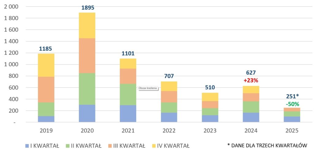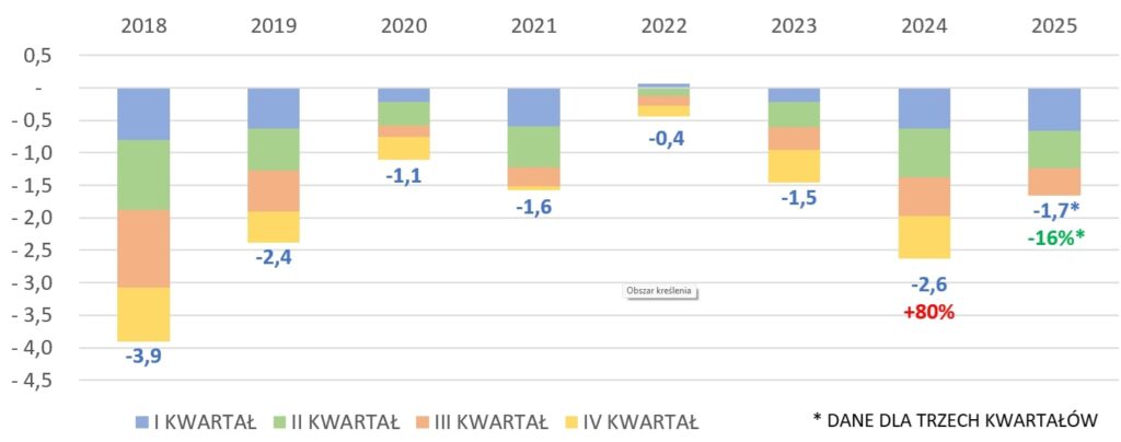 W pierwszych trzech kwartałach br. ilość polskiego drewna przetwarzanego poza granicami kraju zmniejszyła się o 300 tys. m3. W tym samym okresie w Lasach Państwowych ograniczono pozyskanie i sprzedaż drewna o 600 tys. m3. Mimo to – bilans wwozu i wywozu drewna surowego do Polski był lepszy w 2025 niż w 2024 r.