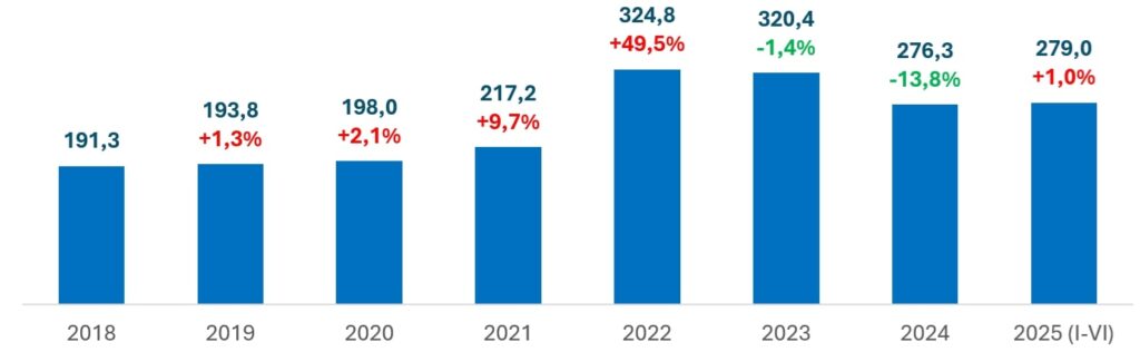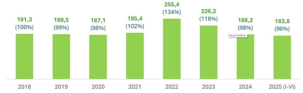 Średnia cena sprzedaży drewna w PGL Lasy Państwowe w cenach bieżących (zł/m3) oraz zmiana rok do roku (%). Źródło: DGLP. Za: MKiŚ– W pierwszym półroczu 2025 roku nastąpił nieznaczny wzrost ceny drewna (+1%), jednak był on niższy niż wskaźnik inflacji (+3,7%). W rezultacie w pierwszym półroczu 2025 średnia cena drewna, pomniejszona o inflację, osiągnęła najniższy poziom od roku 2018 – czytamy w raporcie.