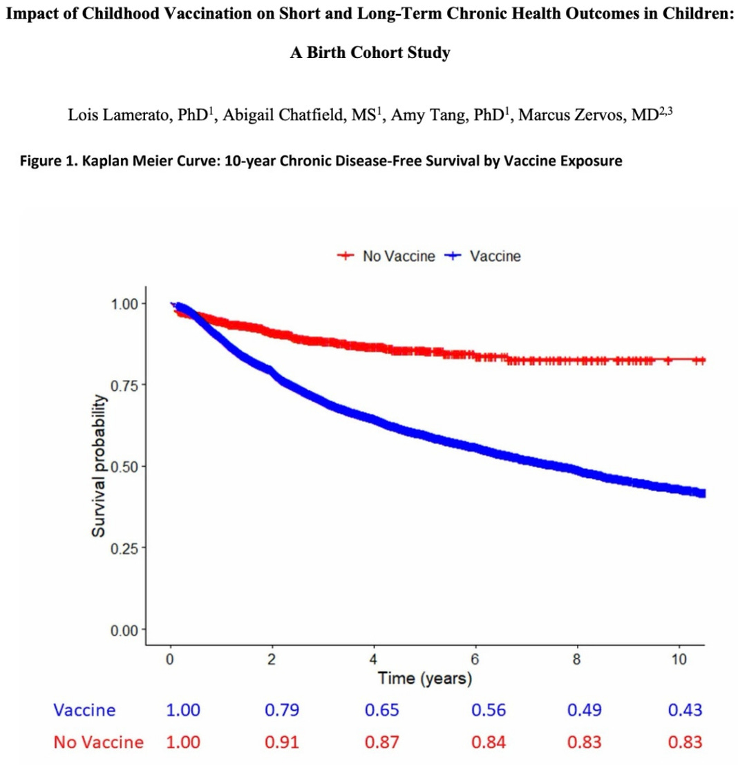 Rysunek 1 z badania (pierwotnie opublikowany w serwisie The HighWire) przedstawia krzywą przeżycia Kaplana-Meiera, obrazowo ilustrując załamanie się wskaźnika przeżycia bez choroby wśród zaszczepionych dzieci w porównaniu z ich nieszczepionymi rówieśnikami w ciągu 10 lat:
