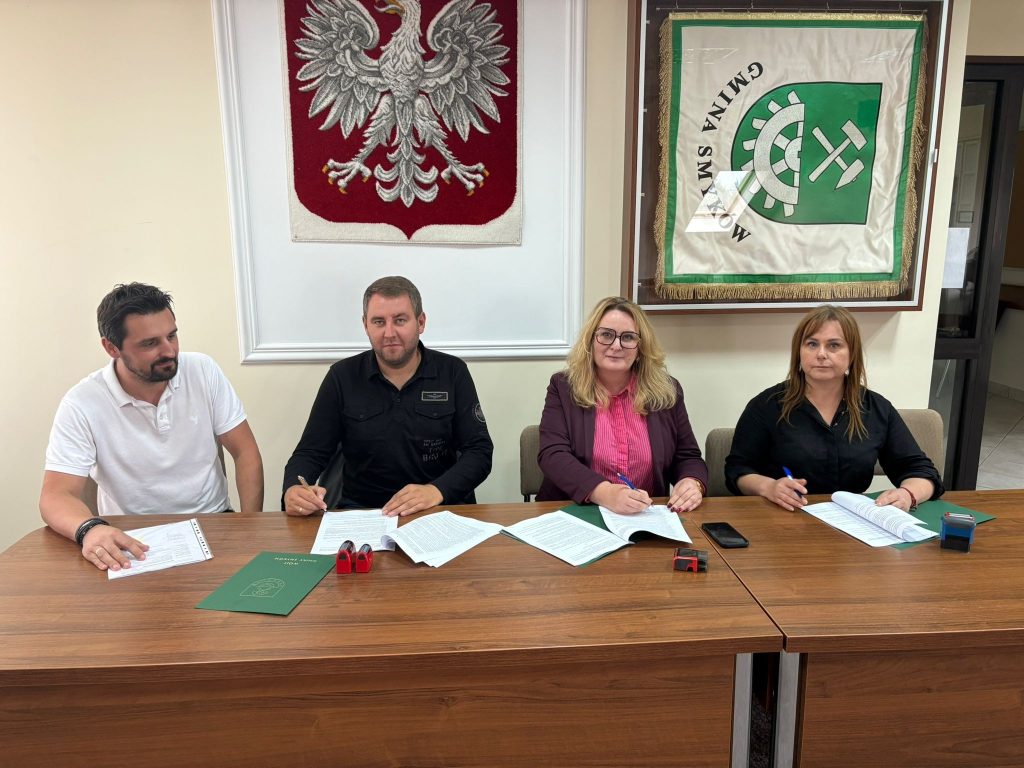 Wójt gminy Smyków Beata Janiszewska, przy kontrasygnacie skarbnika Agnieszki Chyb, podpisała umowę z przedstawicielem firmy GB Technology, Grzegorzem Ludwickim, dotyczącą realizacji zadania pn. „Rozbiórka i budowa budynku zaplecza sanitarno-szatniowego oraz wymiana nawierzchni ze sztucznej trawy zespołu boisk sportowych ORLIK 2012 w Smykowie”.