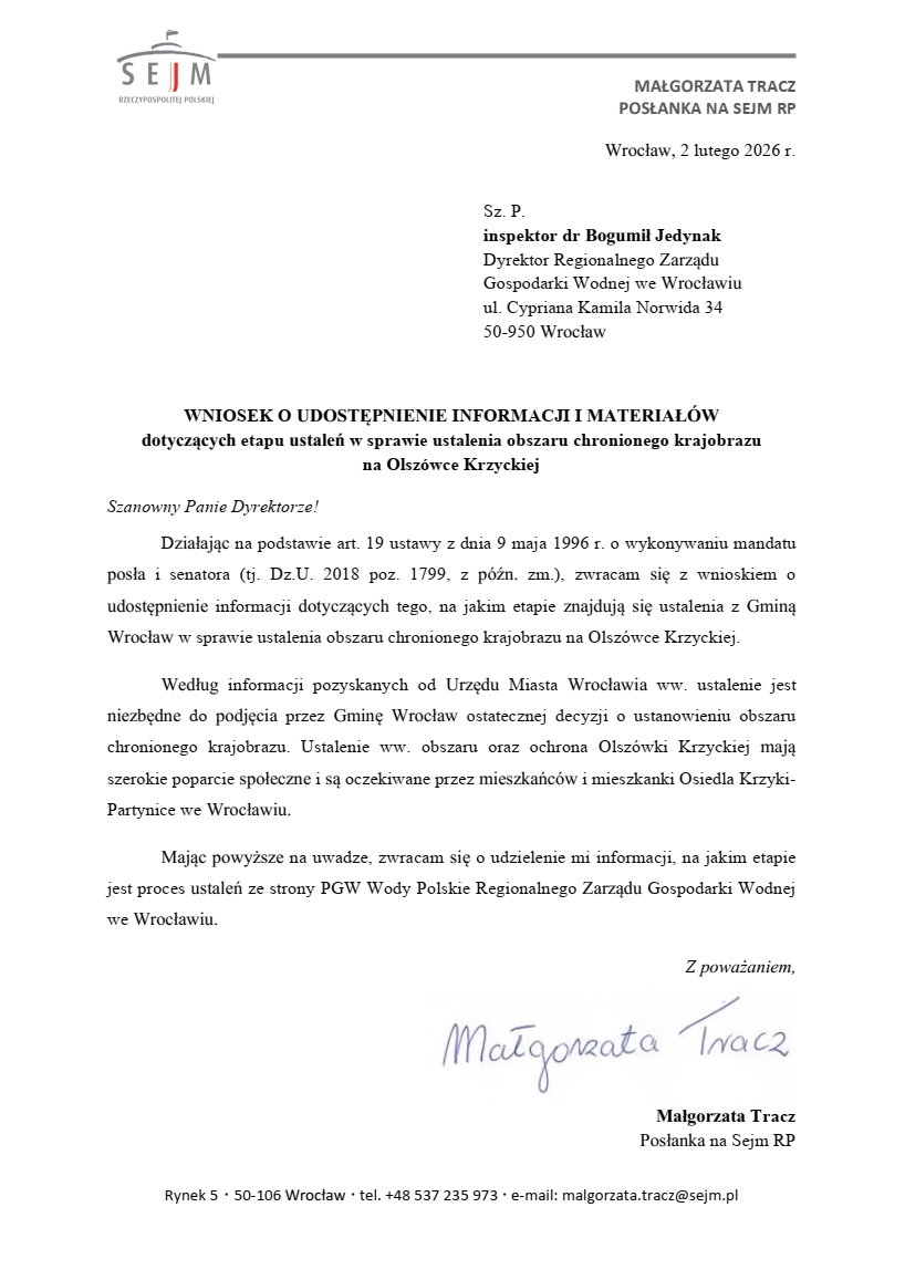 W sprawie Olszówki Krzyckiej zwróciłam się również do Dyrektora Regionalnego Zarządu Gospodarki Wodnej we Wrocławiu, u którego złożyłam wniosek o udostepnienie informacji i materiałów dotyczących etapu ustaleń w sprawie ustalenia obszaru chronionego krajobrazu: