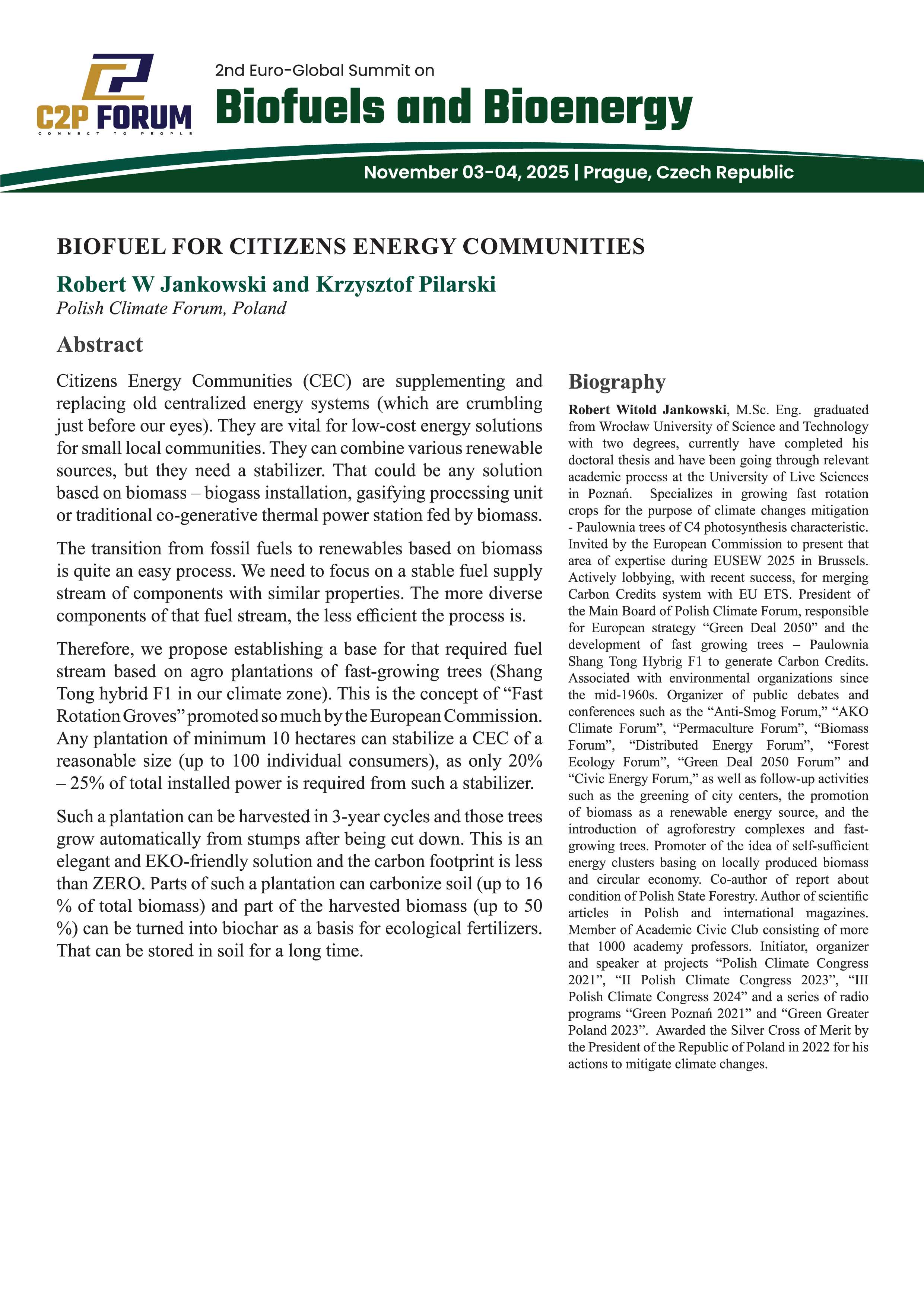 Na zaproszenie organizatora „C2P Forum” Polskie Forum Klimatyczne wystąpiło na kongresie „2nd Euro-Global Summit on Biofuels and Bioenergy”. Szczyt odbył się w stolicy Republiki Czeskiej, Pradze w dniach 3-4.11.2025.