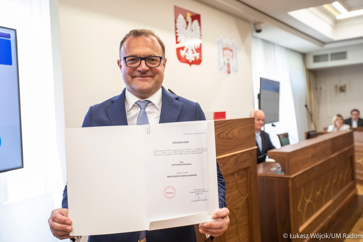 Radosław Witkowski w momencie odbioru zaświadczenia o wyborze na prezydenta (fot Łukasz Wójcik/UM Radom/archiwum)