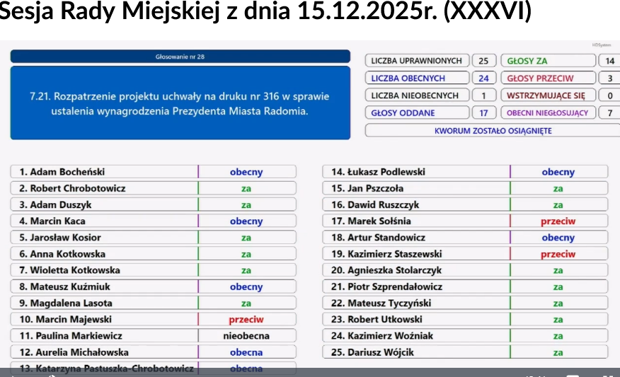 W głosowaniu wzięło udział tylko 17 radnych, choć na sali obecnych było 24. Za podwyżką pensji opowiedziało się 14 osób (KO, PSL, Dariusz Wójcik), przeciw było 3 - Marcin Majewski, Marek Sołśnia, Kazimierz Staszewski - wszyscy z PiS. Pozostali radni Prawa i Sprawiedliwości: Artur Standowicz, Marcin Kaca, Mateusz Kuźmiuk, Katarzyna Pastuszka-Chrobotowicz i Aurelia Michałowska (niezrzeszona) nie oddali w ogóle głosu.