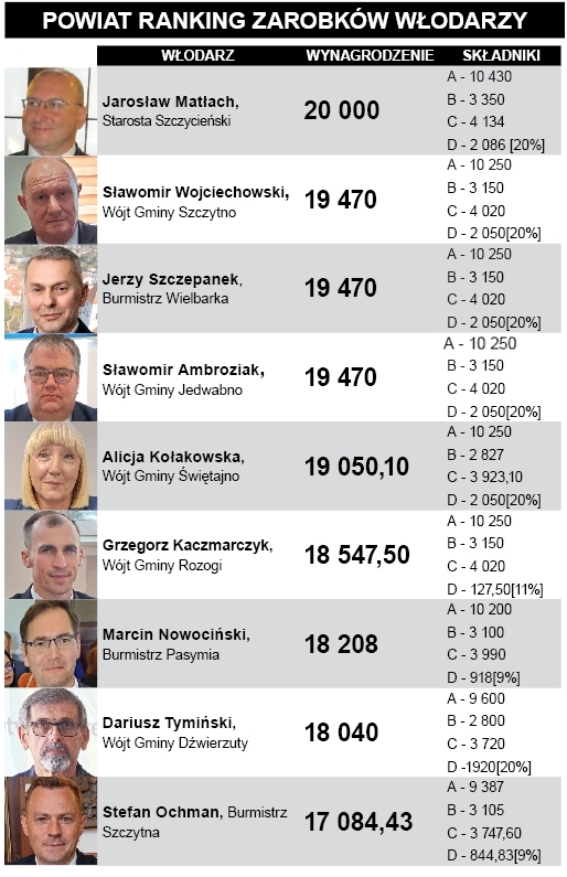 Różnice w zarobkach włodarzy w powiecie szczycieńskim nie będą w tej kadencji zbyt duże. „Najbogatszy” starosta otrzyma co miesiąc o niespełna 3 tys. zł więcej od „najbiedniejszego” burmistrza Szczytna.{akeebasubs !*}{loadposition content_restricted}{/akeebasubs}{akeebasubs *}