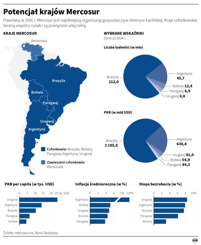 Parlament Europejski skierował pod koniec stycznia wniosek o zbadanie zgodności umowy z unijnymi traktatami do Trybunału Sprawiedliwości UE. W połowie marca br. Sejm przyjął uchwałę, w której zwrócił się do rządu o wniesienie skargi do TSUE w imieniu Polski, niezależnie od skargi złożonej przez Parlament Europejski. Na początku kwietnia prezydent Karol Nawrocki skierował do premiera Donalda Tuska list z żądaniem natychmiastowego zaskarżenia umowy UE z krajami Mercosur do TSUE.