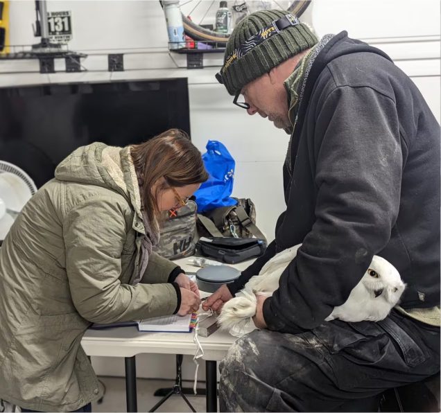 Specjaliści od ptaków drapieżnych z Ontario, Charlotte England i Malcolm Wilson, umieścili nadajnik GPS na sowie śnieżnej o imieniu Newton w ramach projektu SNOWstorm.