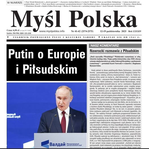 Polska. Od jutra można nabyć nowy numer „Myśli Polskiej” (41-42, 12-19.10.2025), a w nim miedzy innymi Jan Engelgard „Nawrocki rozmawia z Piłsudskim”, prof. Stanisław Bieleń „Pokój przez siłę”, prof. Anna Raźny „Kto nas obroni”, poseł Tadeusz Samborski „Zbiory Ossolineum powinny być w Polsce” i Mariusz Pomianowski „Sianie chaosu jako narzędzie polityki zagranicznej”.