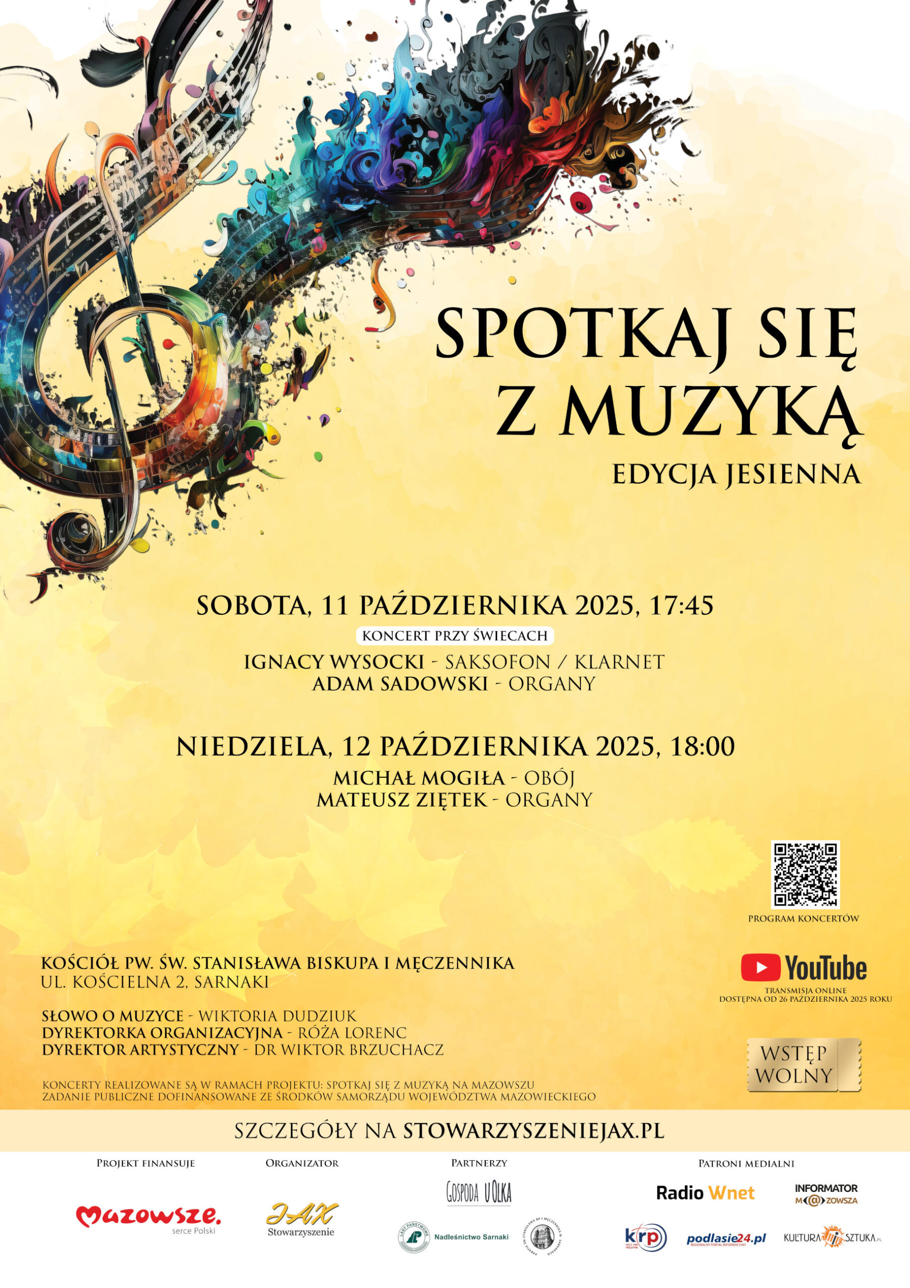 Stowarzyszenie JAX wraz z Samorządem Województwa Mazowieckiego serdecznie zapraszają na jesienną odsłonę koncertów z cyklu „Spotkaj się z muzyką”. Wydarzenia odbędą się 11 i 12 października 2025 roku w Sarnakach, a transmisja online będzie dostępna również w internecie. To kolejna okazja, aby wysłuchać najpiękniejszych dzieł muzyki klasycznej w mistrzowskich interpretacjach.